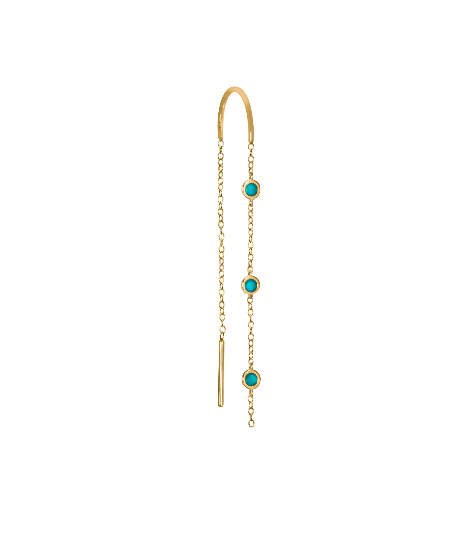 Boucle d’oreille pendante en or jaune, agrémentée de trois pierres de Turquoise.
