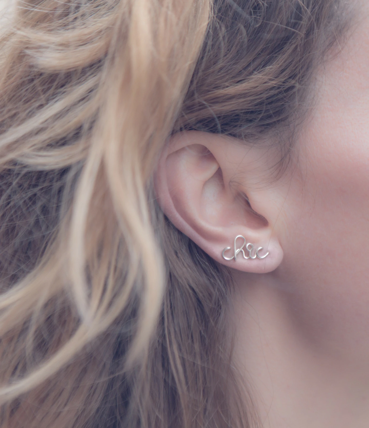Boucle d’oreille composée d’un seul et même fil d’or gold filled jaune, formant le mot “Chic”. Sans fermoir. Vendue à l’unité.