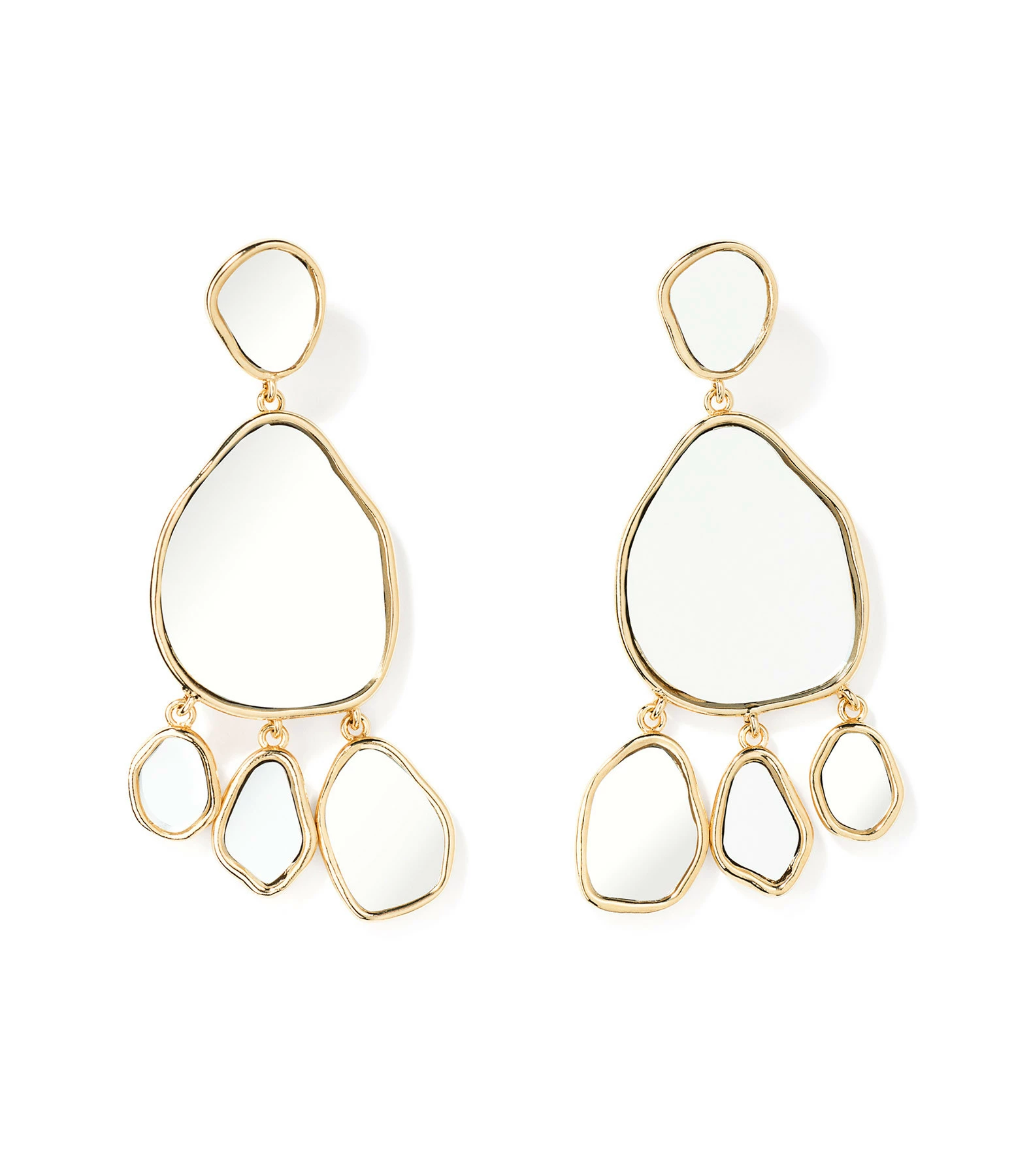 Boucles d’oreilles pendantes en laiton doré parées de véritables miroirs. Fermoir cliquet.