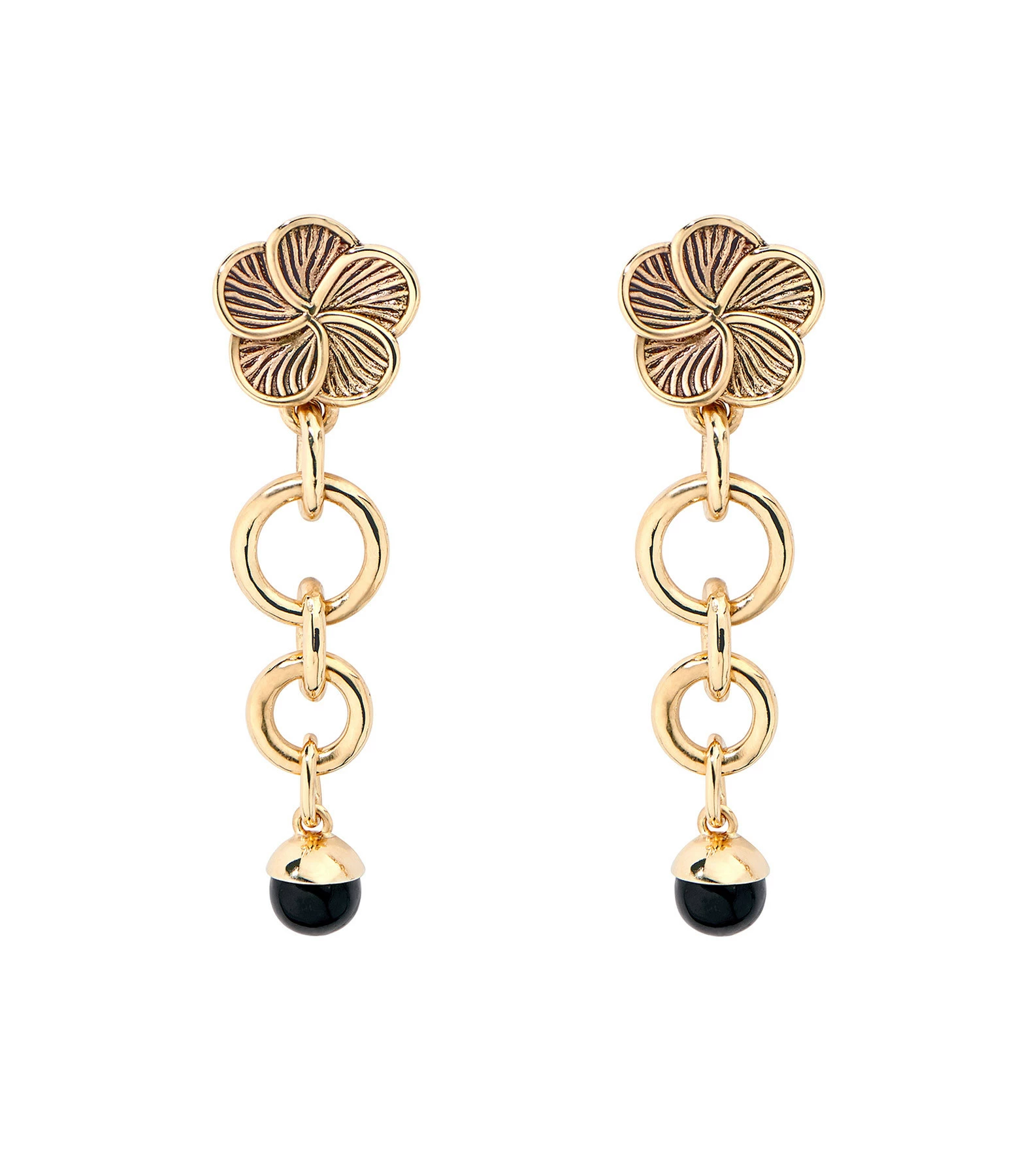 Boucles d’oreilles fleurs pendantes en laiton plaqué or et bakélite. Fermoir poussette.