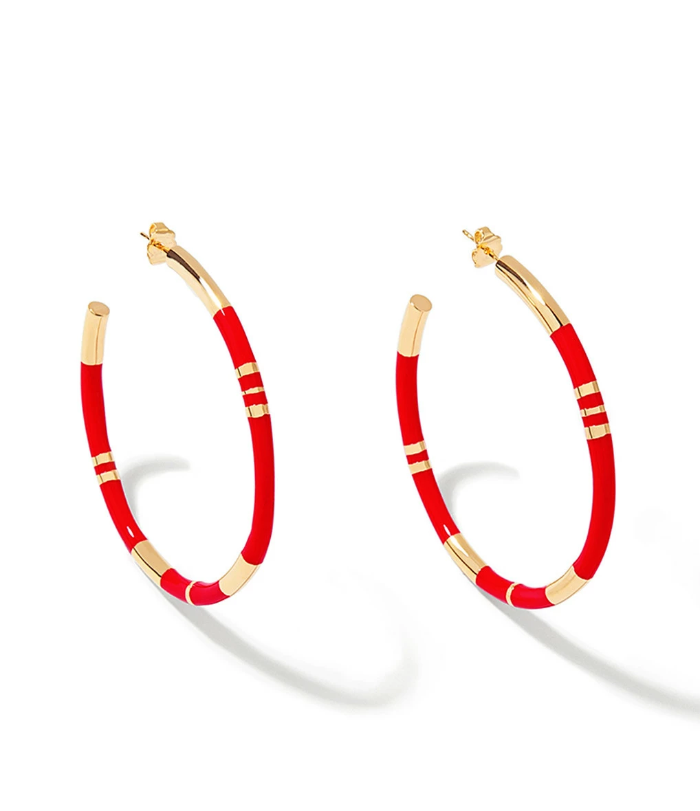 Créoles dorées à l’or jaune avec rayures en résine corail. Fermoir poussette.