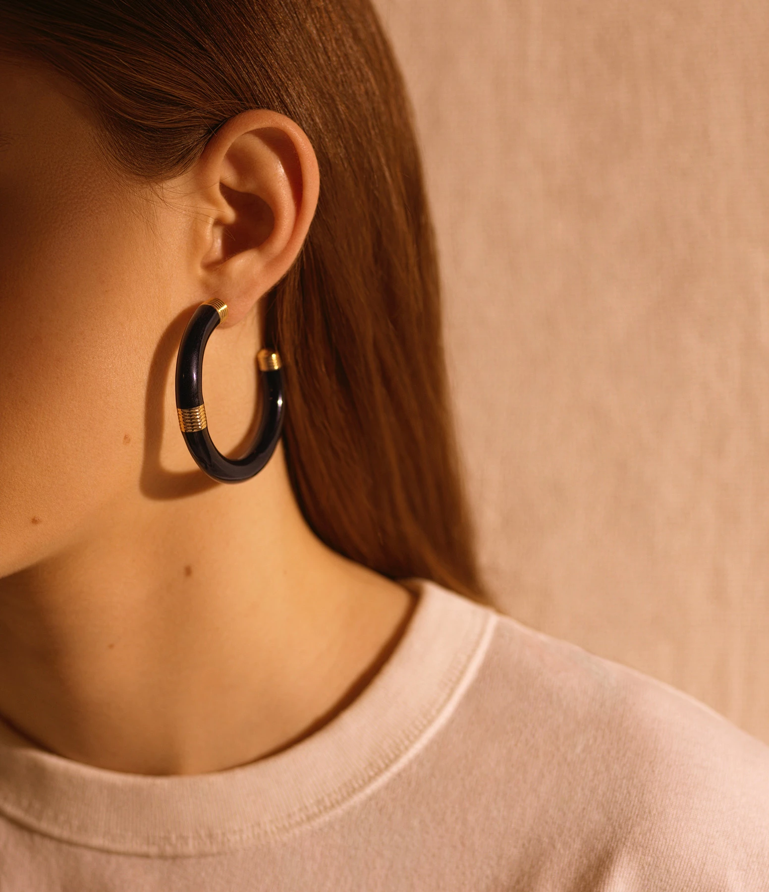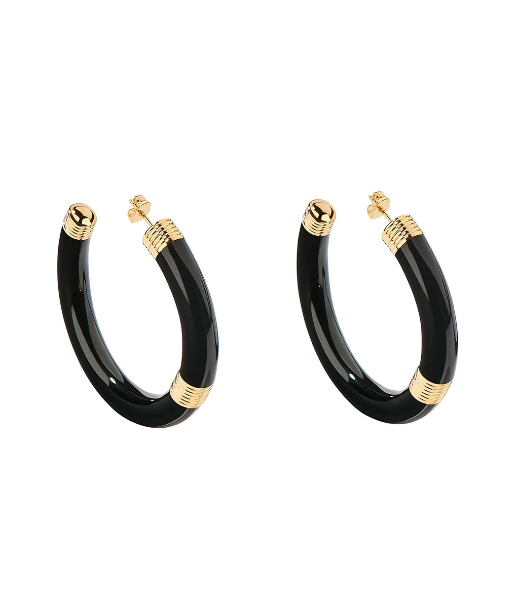 Créoles en résine noire, agrémentées d’ornements plaqués or.
