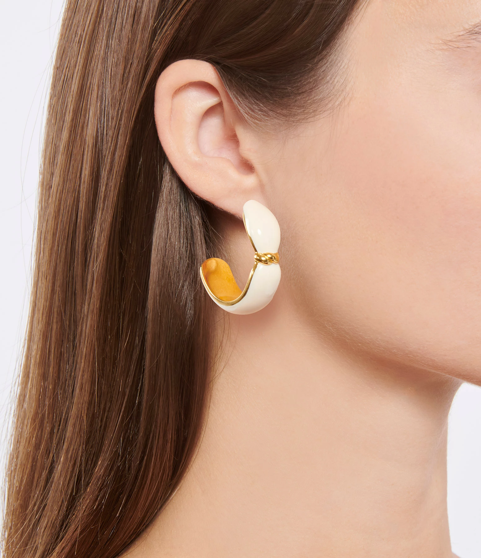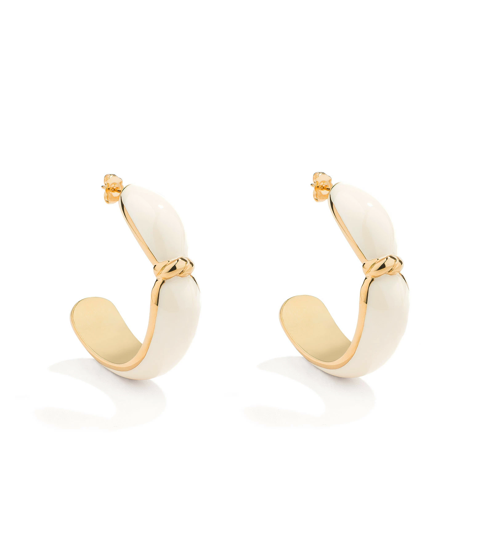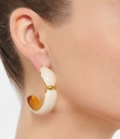 Créoles en résine blanc ivoire, agrémentées d’ornements plaqués or. Fermoir poussette.