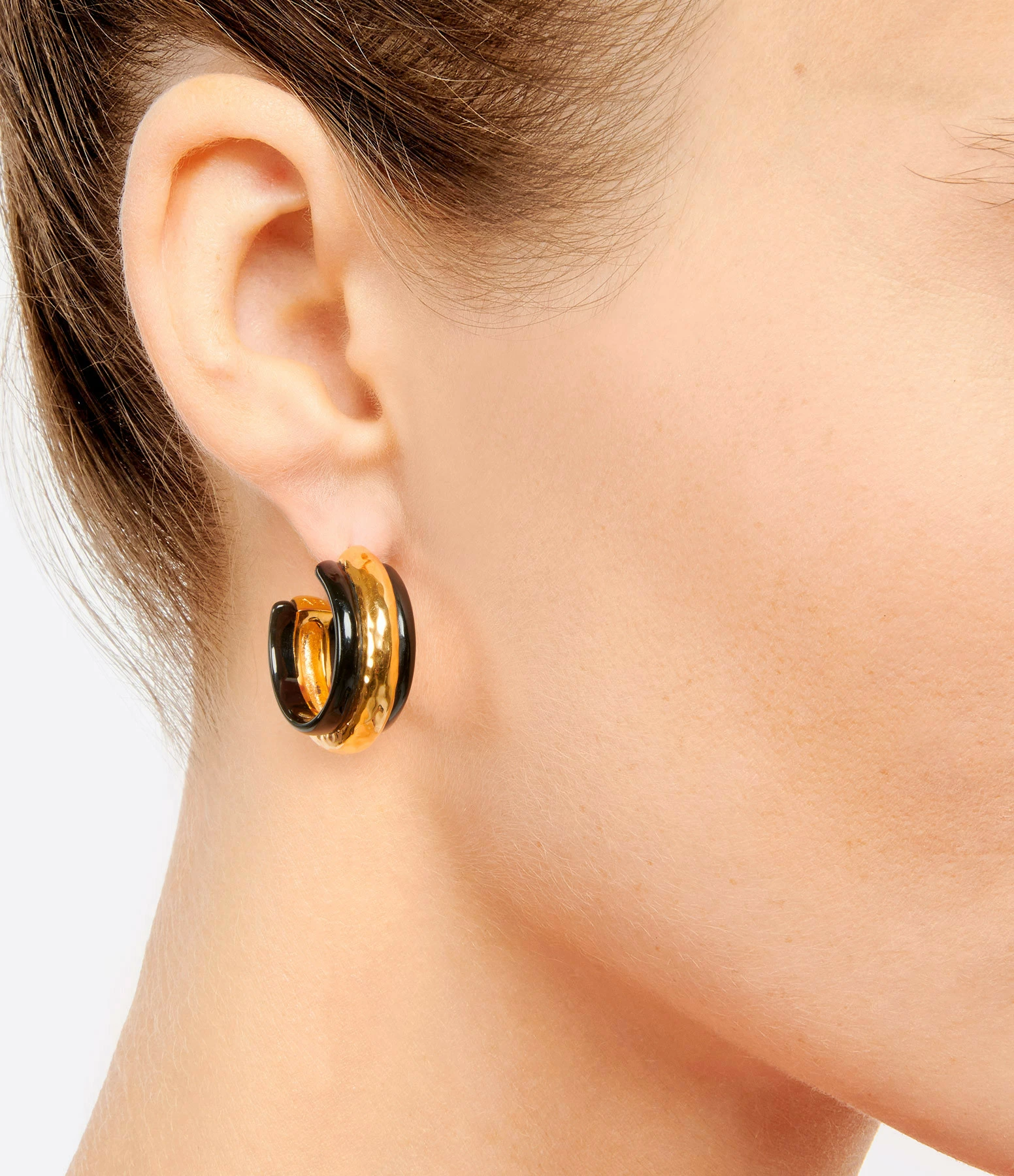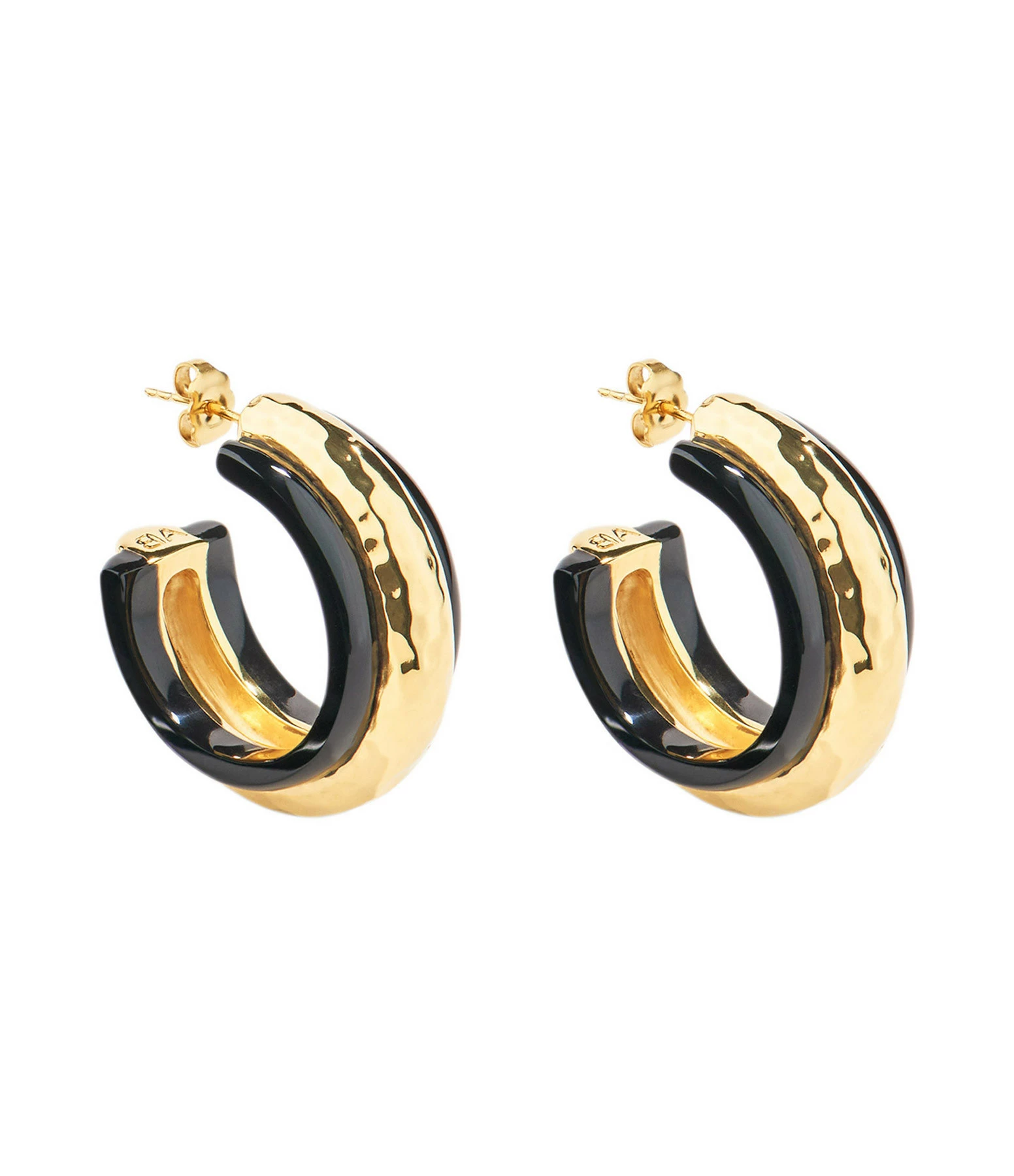Boucles d’oreilles en laiton doré martelé et résine noire. Fermoir poussette.