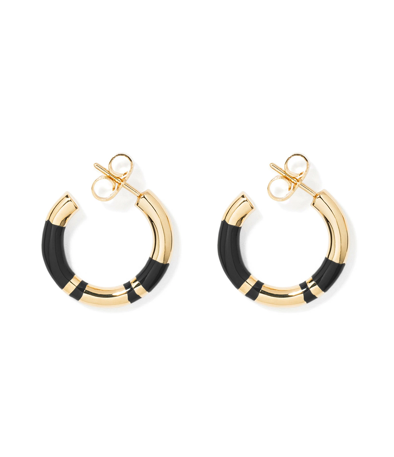 Créoles dorées à l’or jaune avec rayures en résine noire. Fermoir poussette.