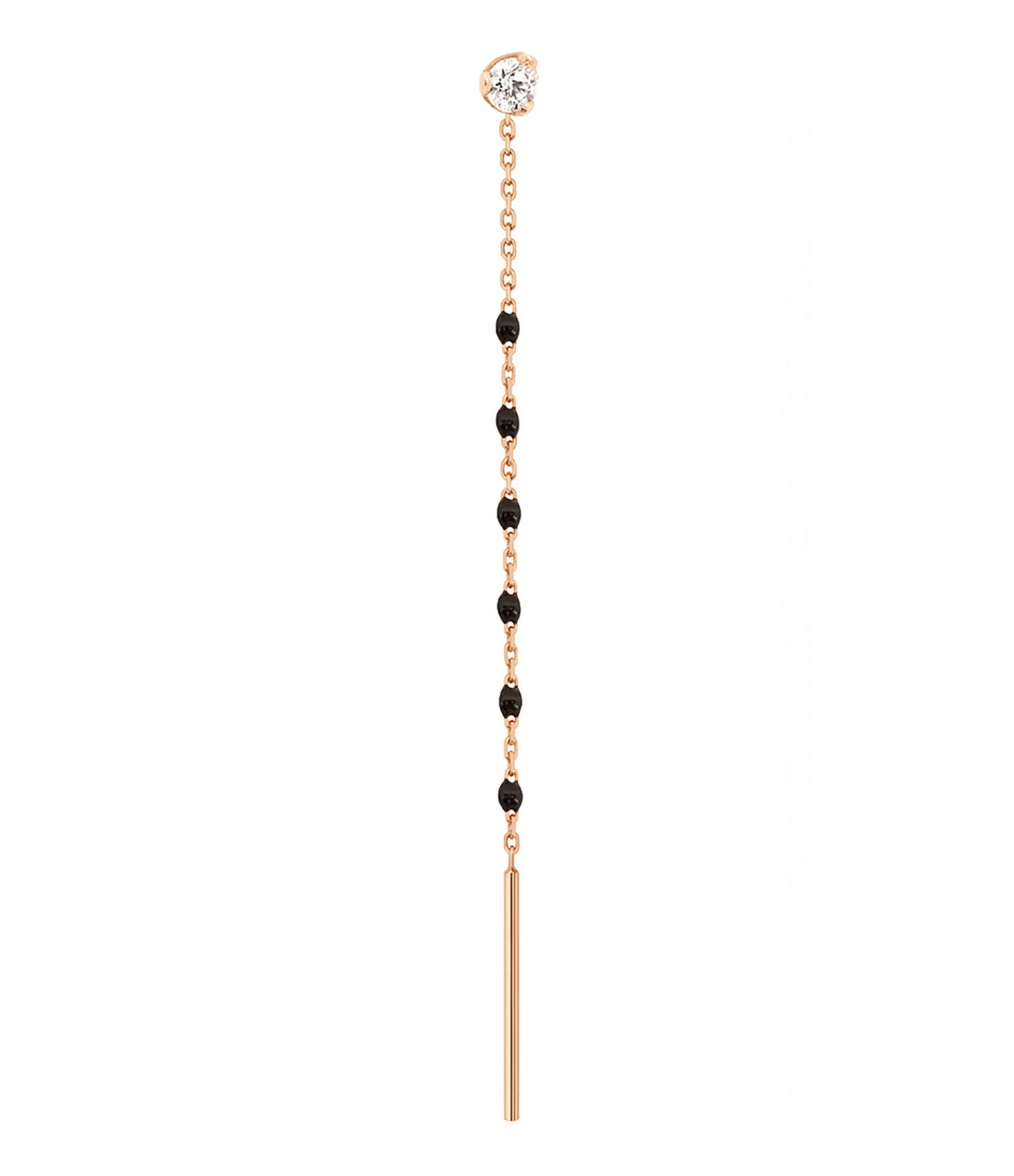 Boucle d’oreille sur chaînette en or rose, jaune ou gris agrémentée de mini perles de résine colorées et sertie d’un diamant blanc de 0,04 carat.Système sans fermoir : la tige et la chaînette sont glissées délicatement dans le trou de l’oreille. Vendue à l’unité.