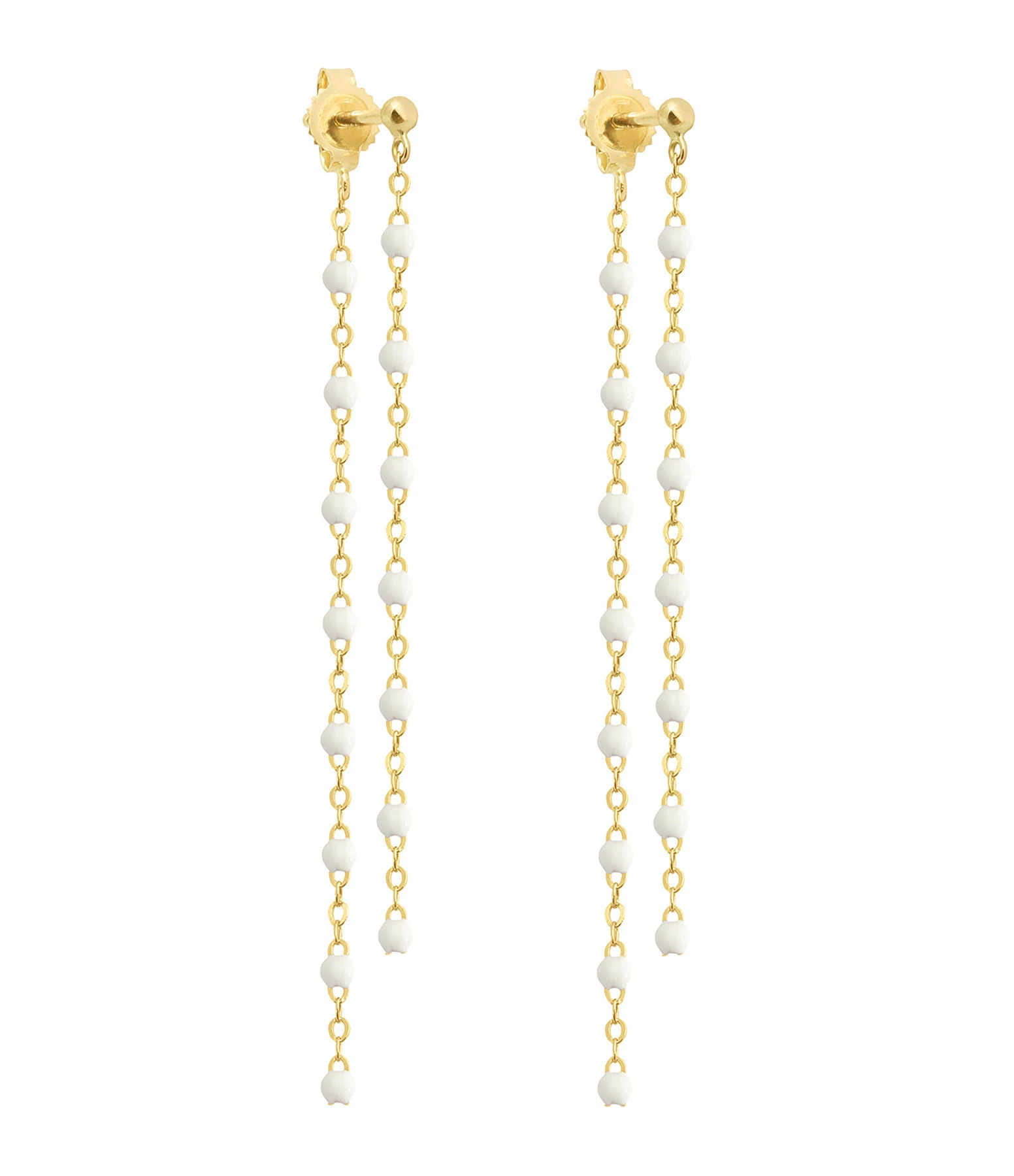 Boucles d’oreilles pendantes en or blanc ou rose, ornées de perles de résine. Fermoir poussette.Le modèle or blanc est proposé uniquement en résine noire et dans les trois résines transparentes.