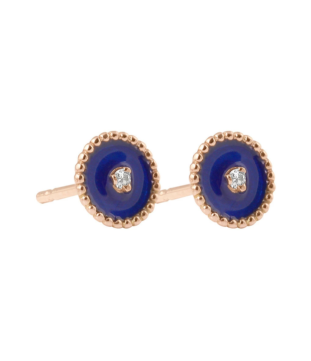 Boucles d’oreilles puces en or gris, jaune ou rose agrémentées de résine et d’un diamant blanc. Fermoir poussette. Vendues à la paire.