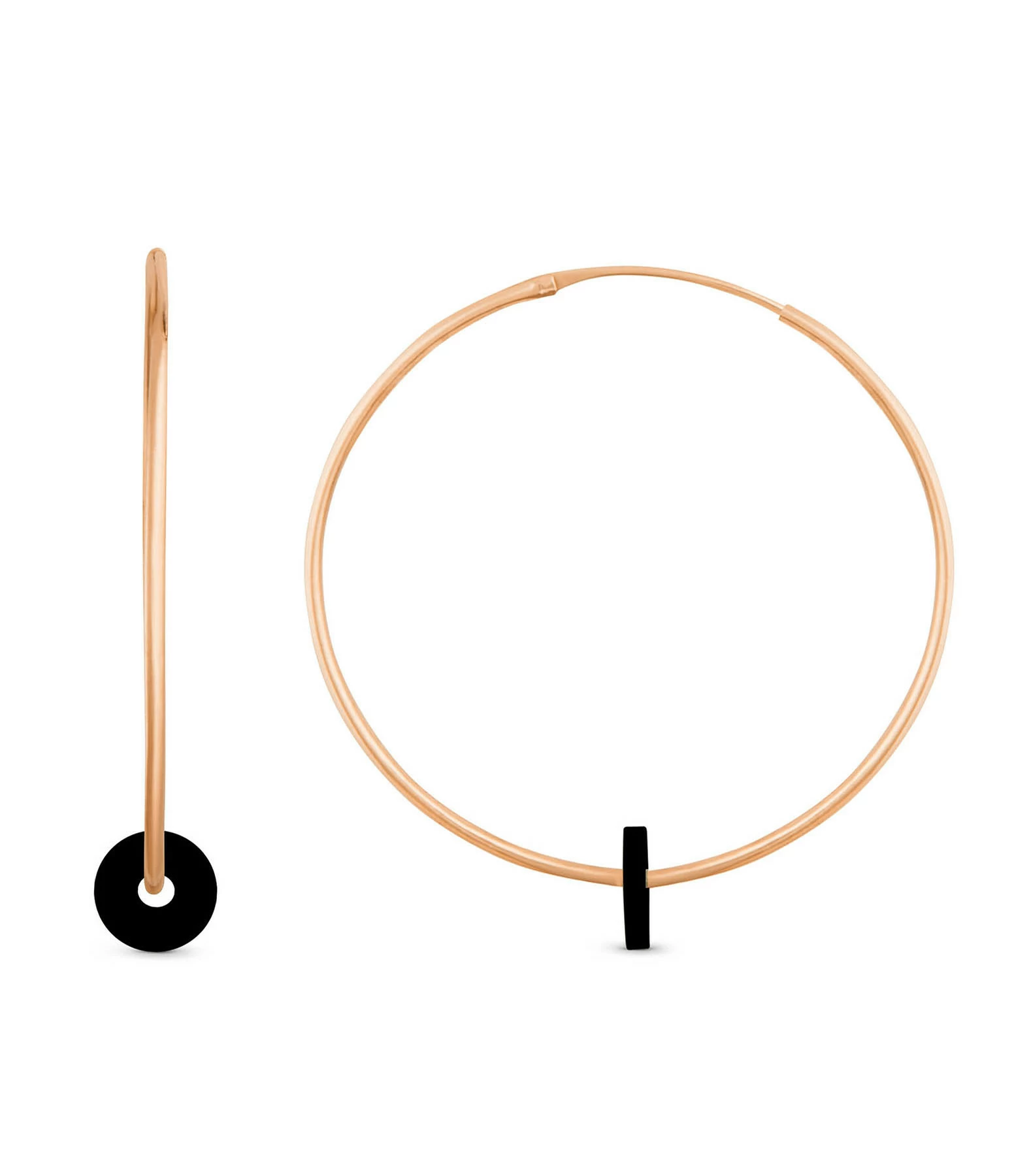 Boucles d’oreille en or rose, avec mini pendentif disque en pierre d’onyx noire. Fermoir créole.