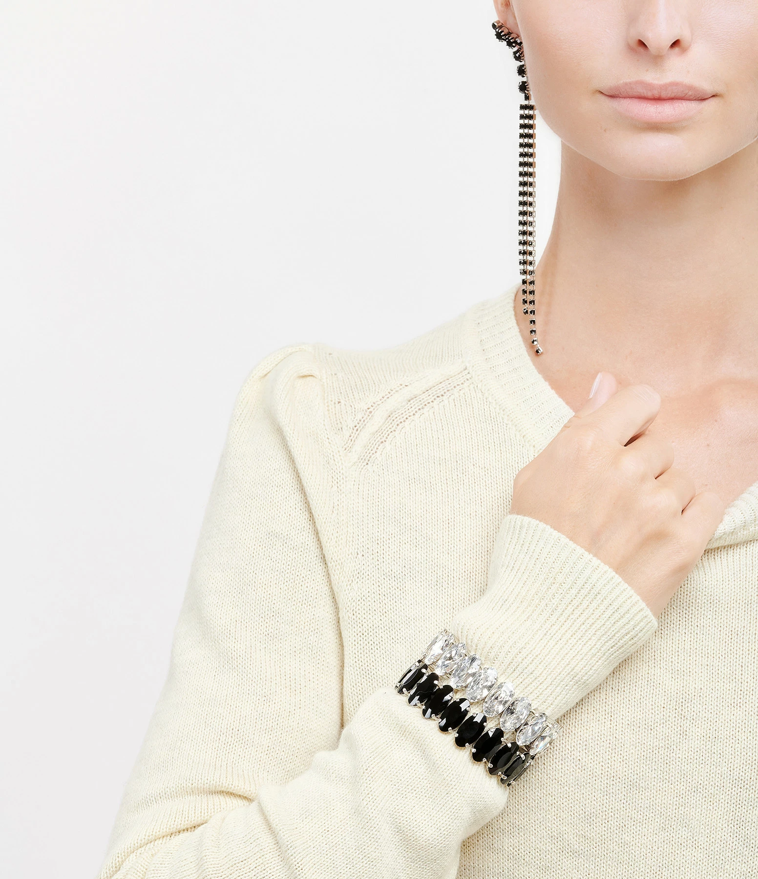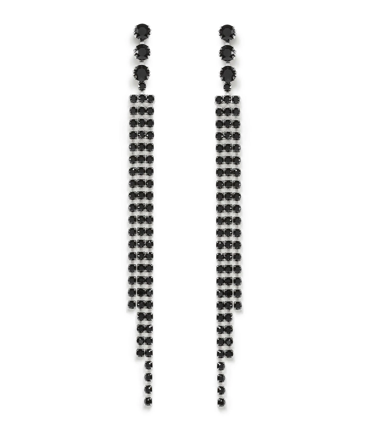 Boucles d’oreilles pendantes argentées et noires en laiton. Trois rangées de perles. Fermoir poussette. Vendues à la paire.
