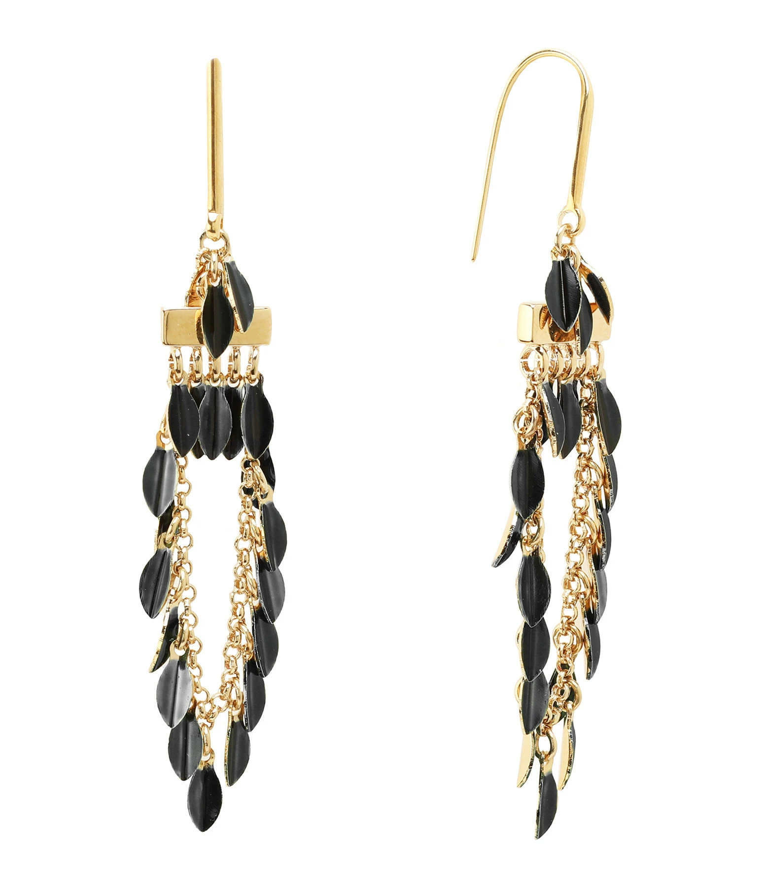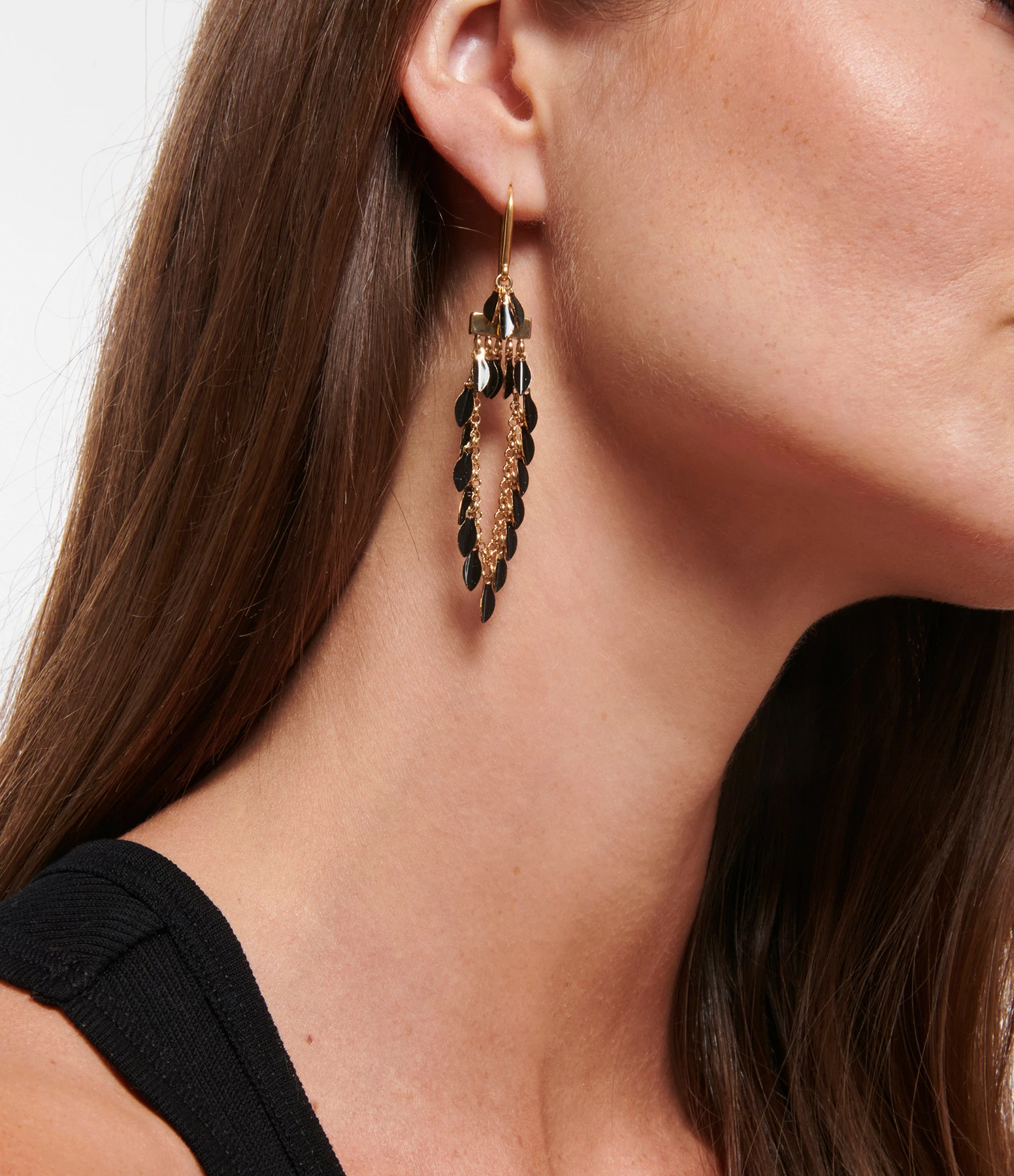 Boucles d’oreilles en laiton doré agrémentées de pampilles noires et dorées. Fermoir loop.