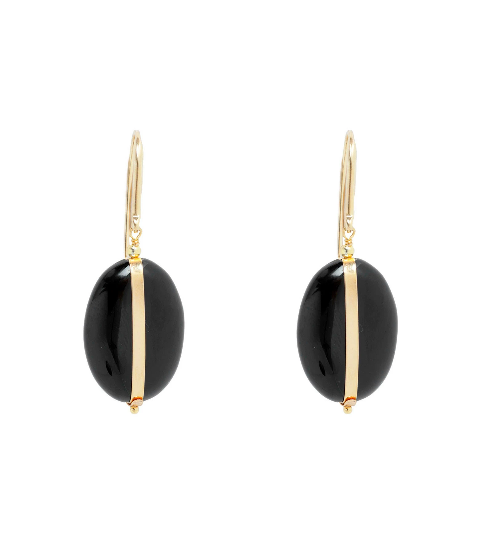 Boucles d’oreilles ovales en laiton doré et pierre noire. Attache crochet.