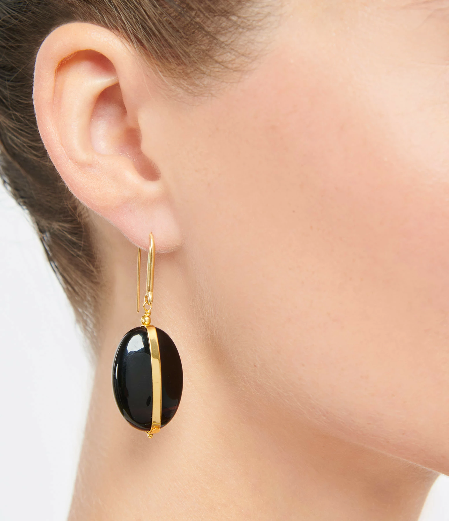 Boucles d’oreilles ovales en laiton doré et pierre noire. Attache crochet.