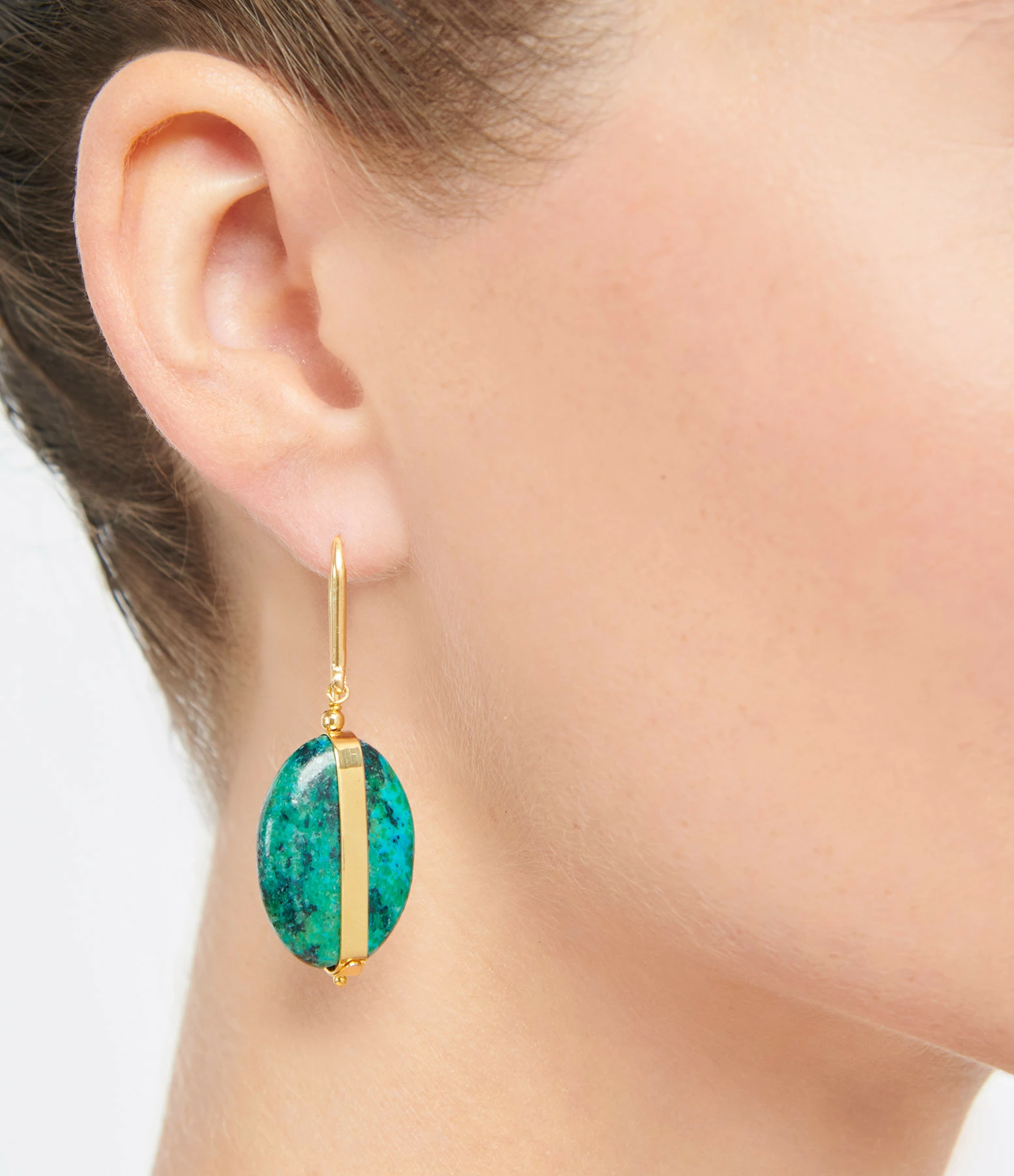 Boucles d’oreilles ovales en laiton doré et pierre verte. Attache crochet.