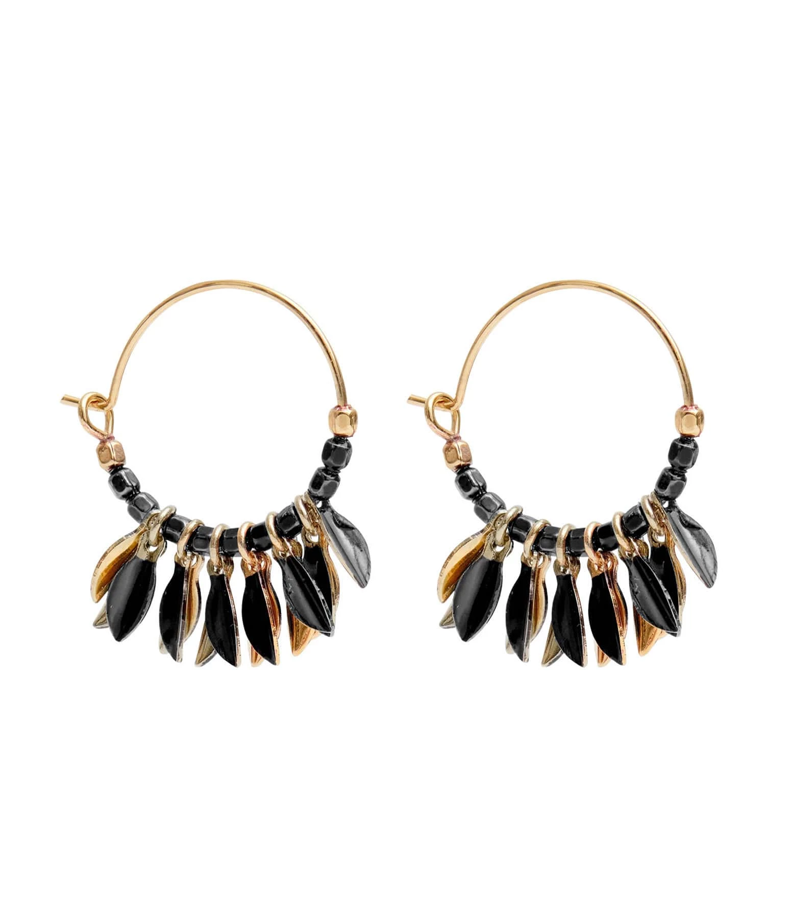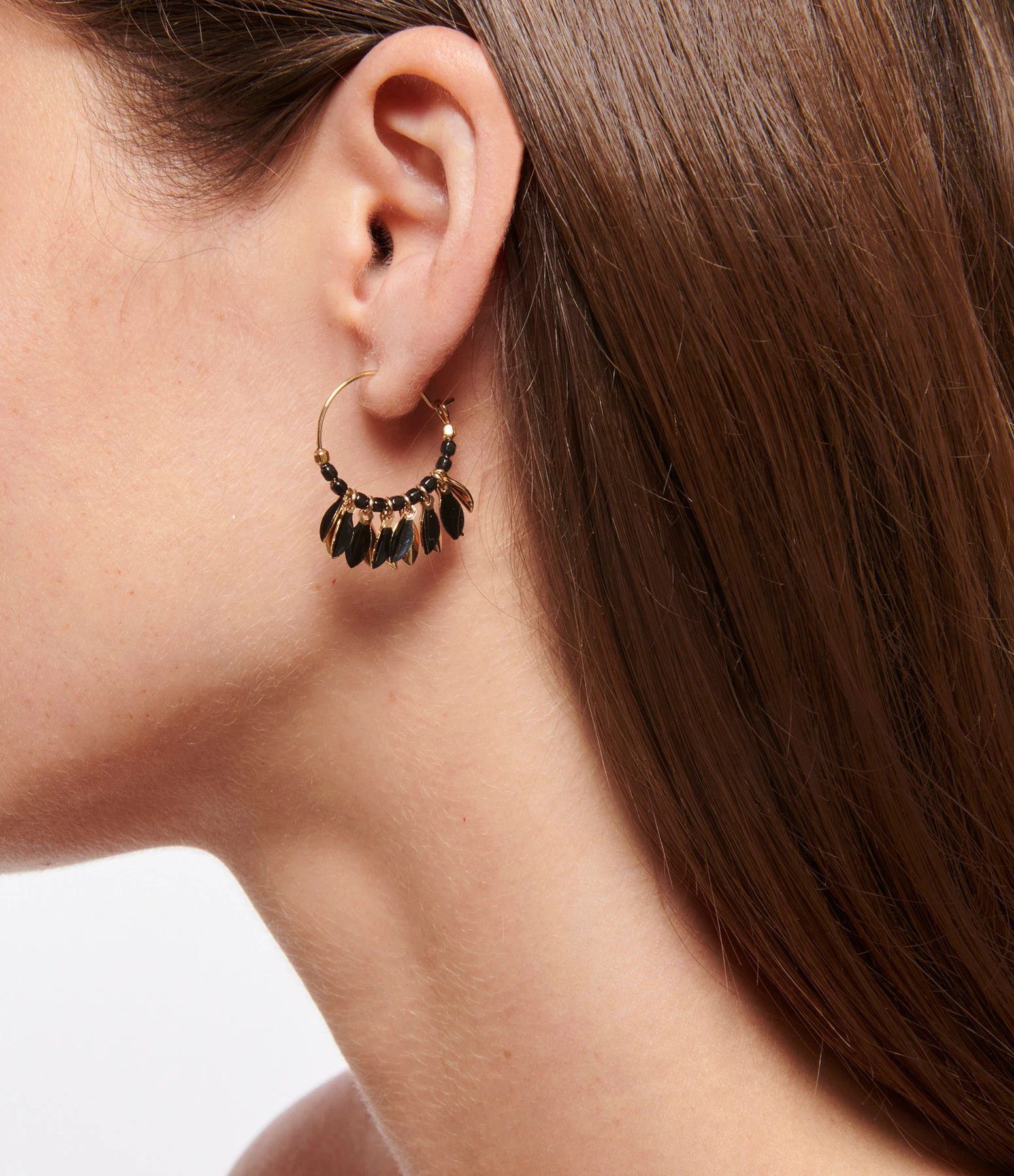 Créoles en laiton agrémentées de pampilles en noire. Fermoir loop.