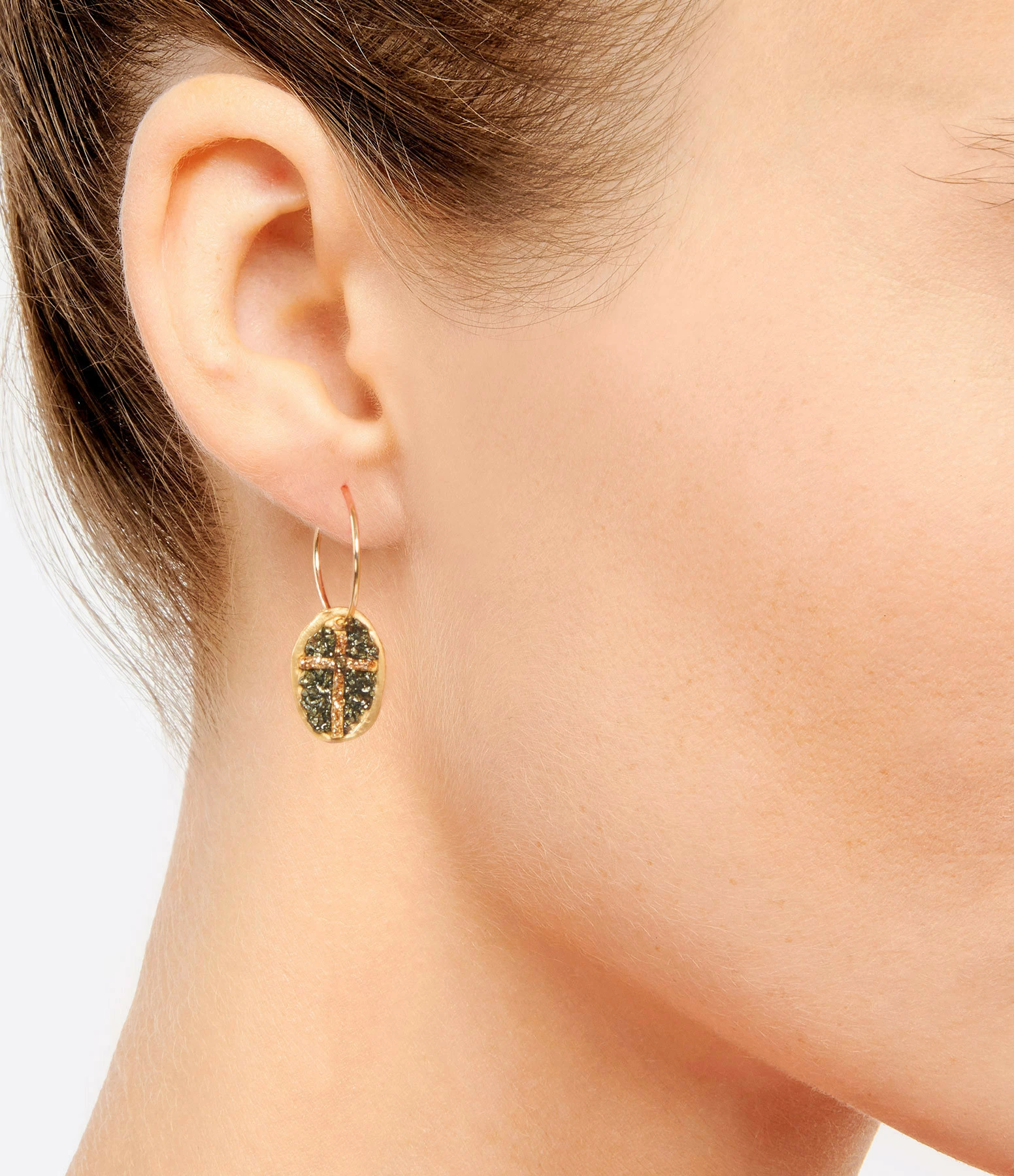 Boucles d’oreilles en argent doré à l’or fin orné d’un médaillon en pierres naturelles et semi-précieuses grises et d’une croix en émail diamanté. Fermoir cliquet.