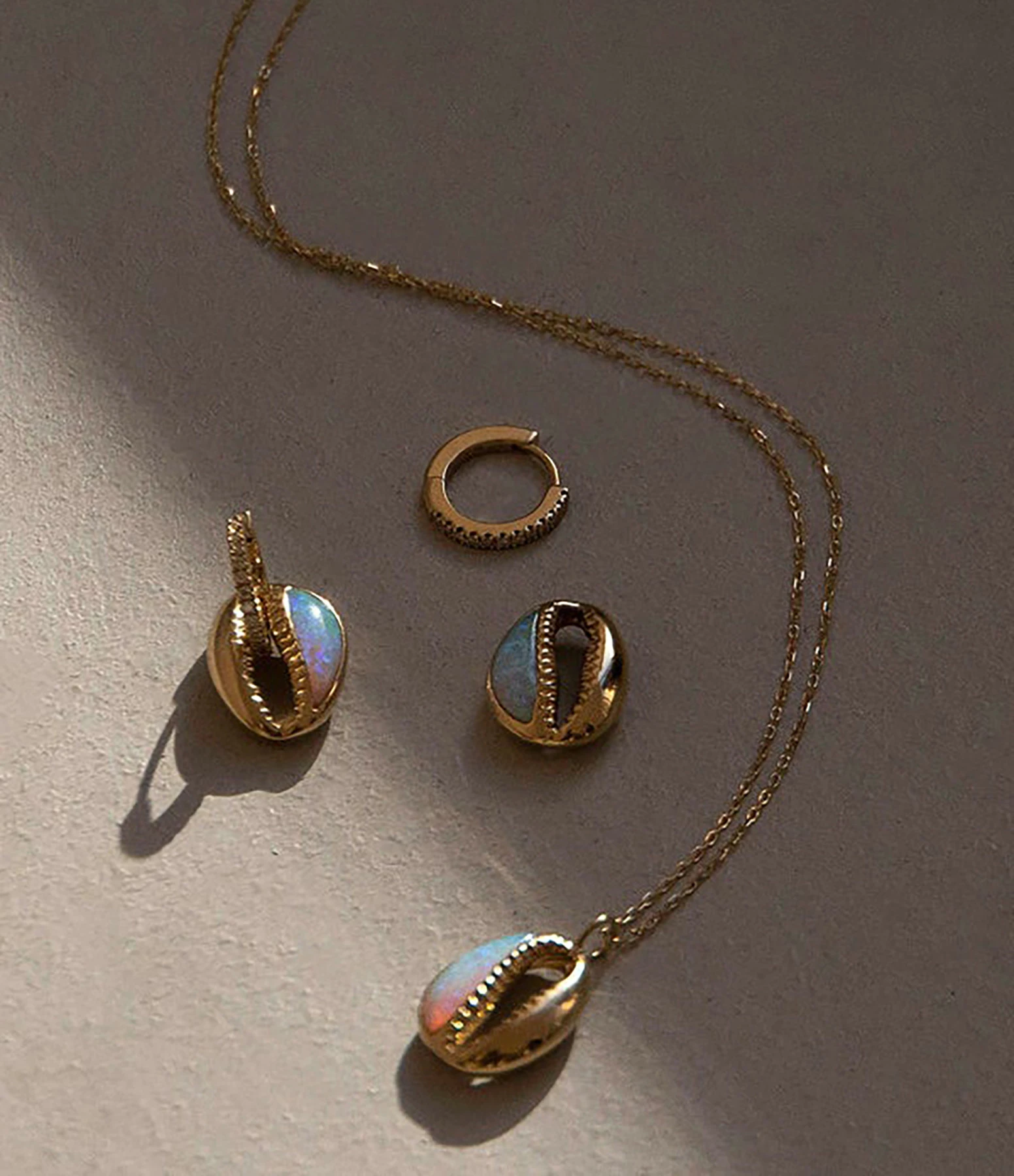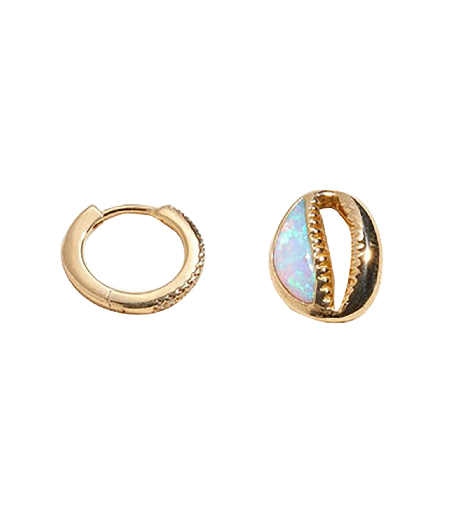 Mini créole en or jaune semi-pavée de diamants blancs, cauri amovible avec opale incrustée. Fermoir cliquet.