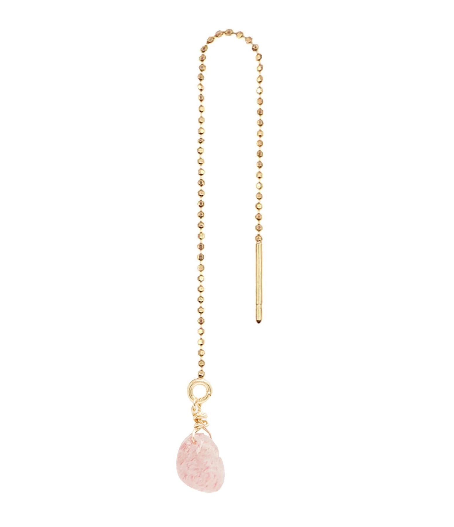 Boucle d’oreille pendante en chaîne en Gold Filled sertie d’une pierre en quartz rose en forme de cœur. Vendue à l’unité.