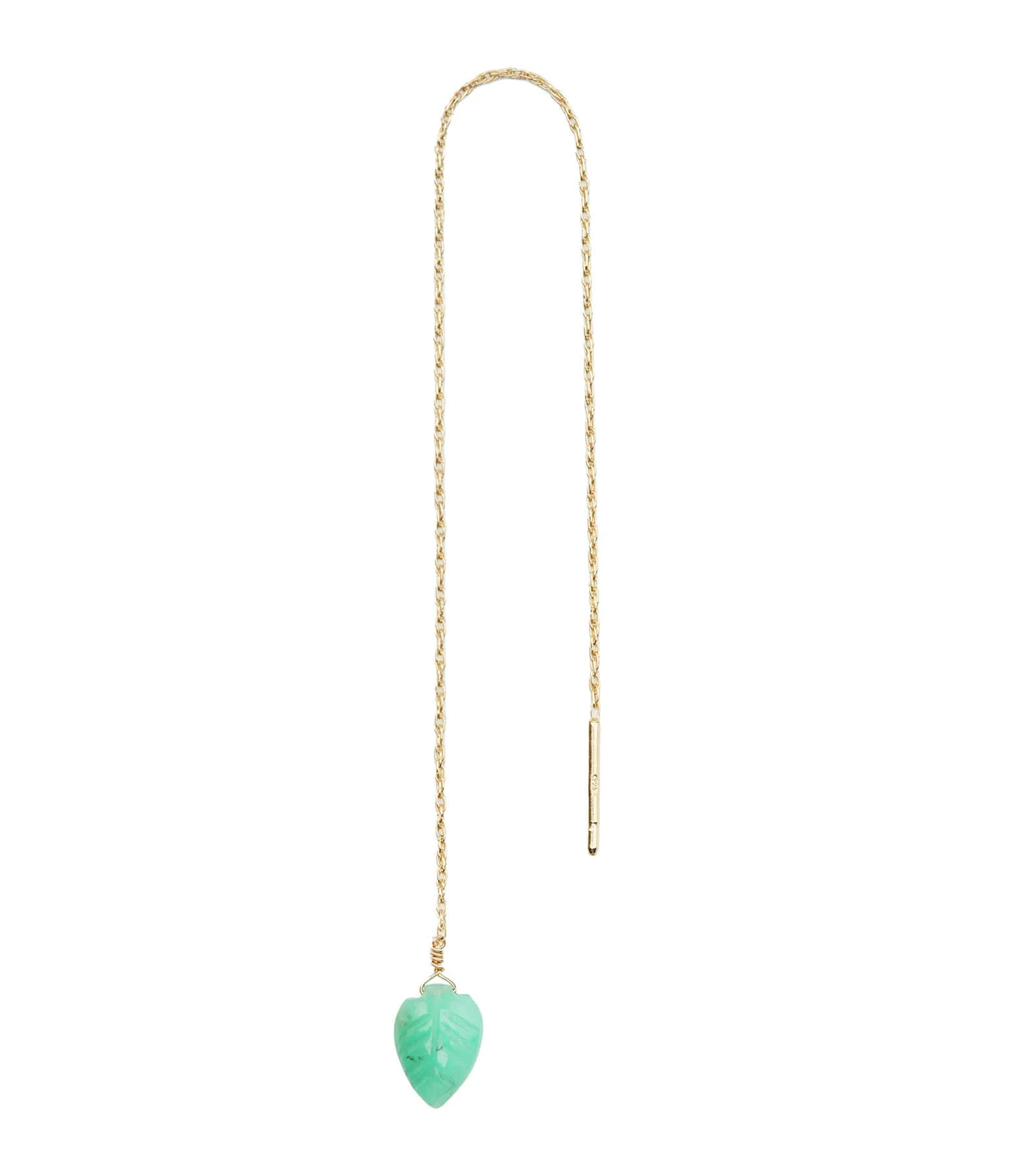 Boucle d’oreilles pendante en or jaune agrémentée d’une pierre de Chrysoprase. Système sans fermoir : la tige et la chaînette sont glissées délicatement dans le trou de l’oreille.