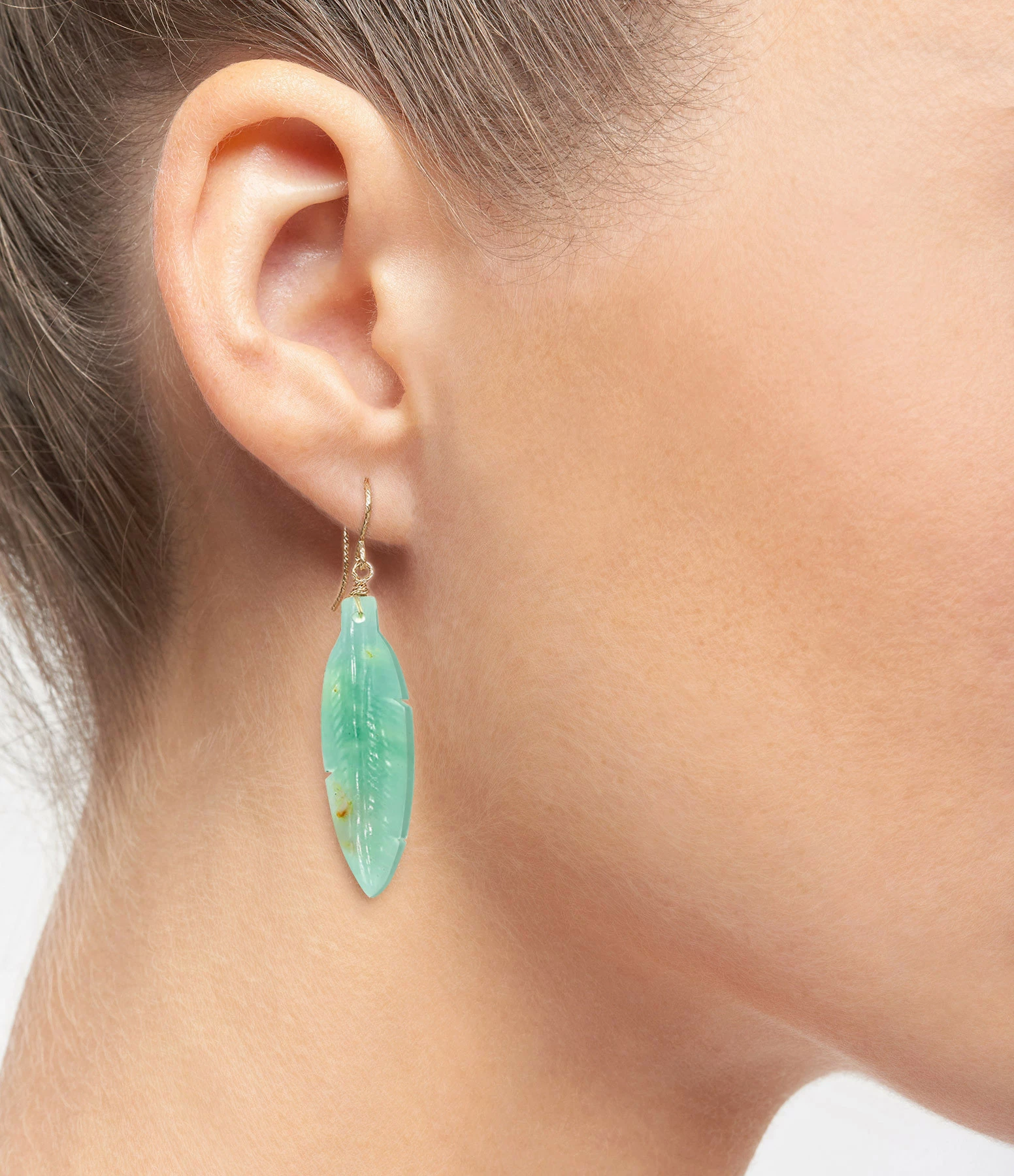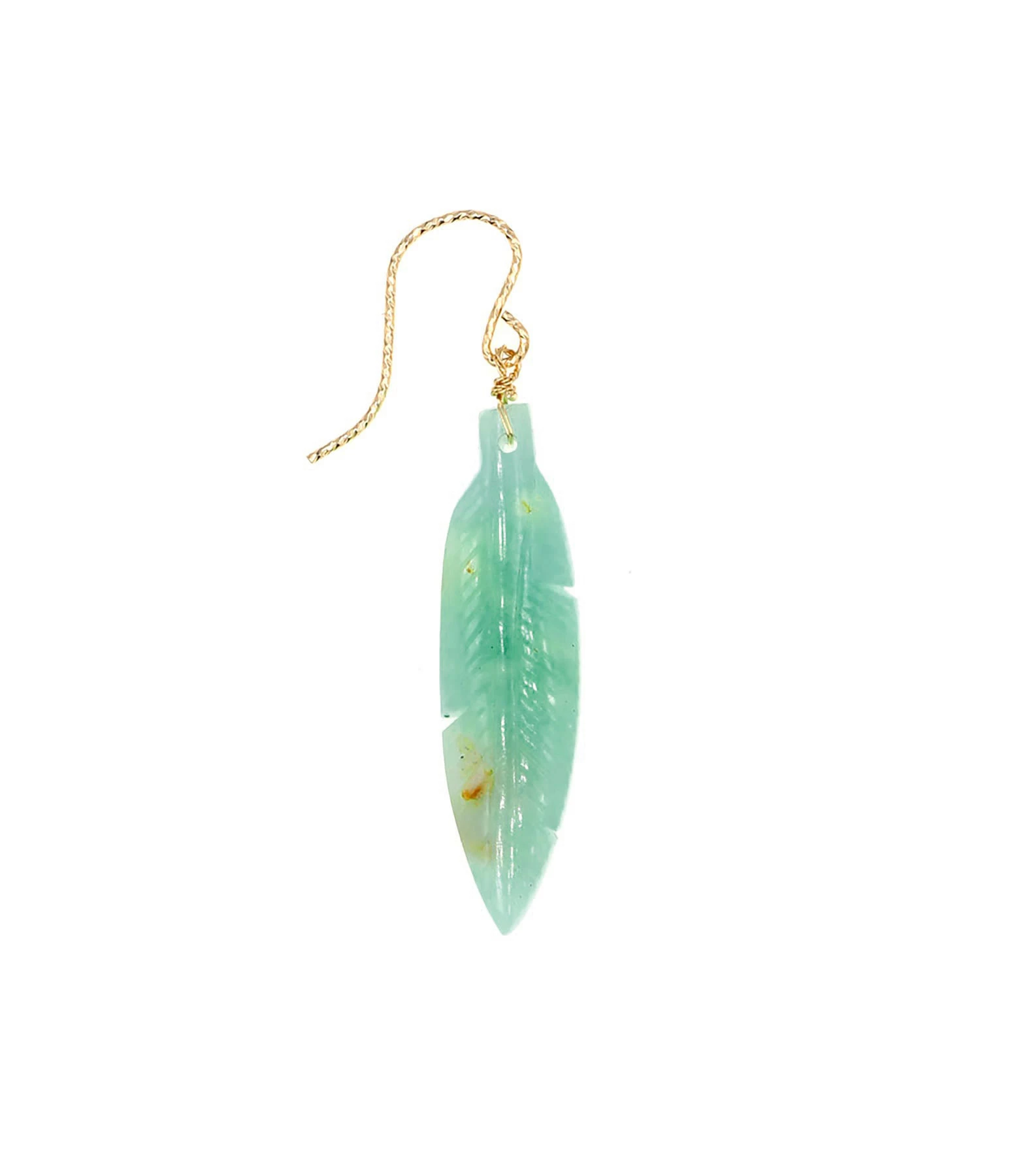 Boucle d’oreille plume en Chrysoprase. Attache crochet en gold filled.
