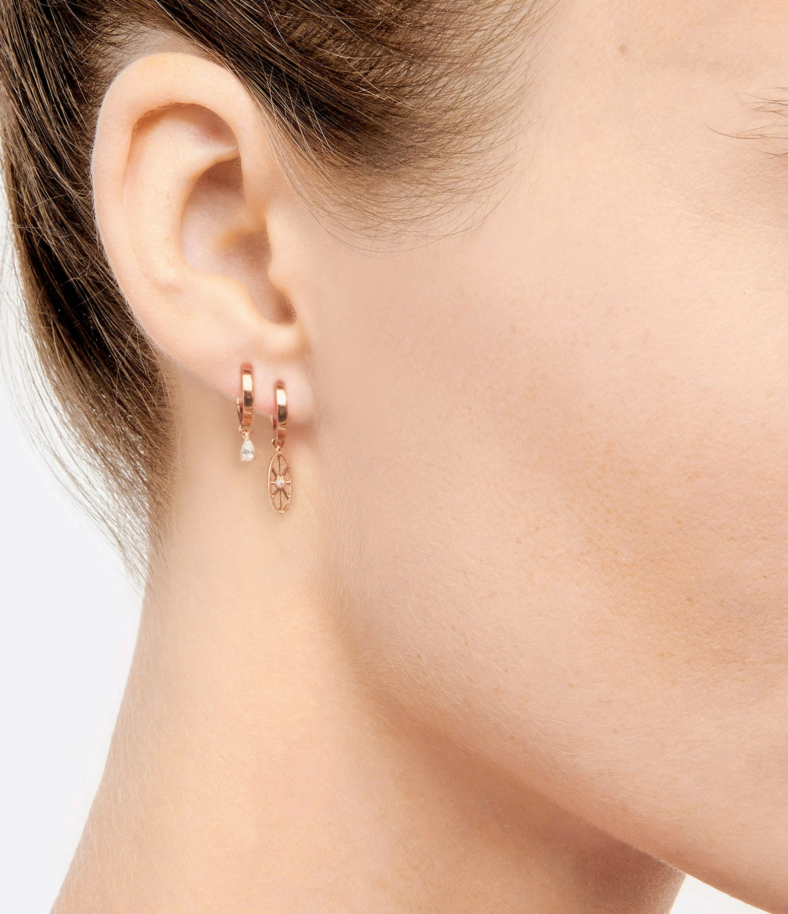 Boucle d’oreille en or rose avec pendentif ovale serti d’un diamant rond. Fermoir à cliquet.