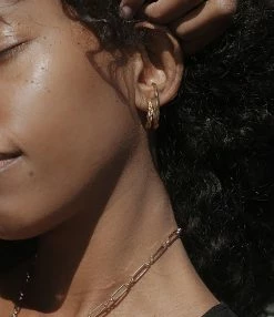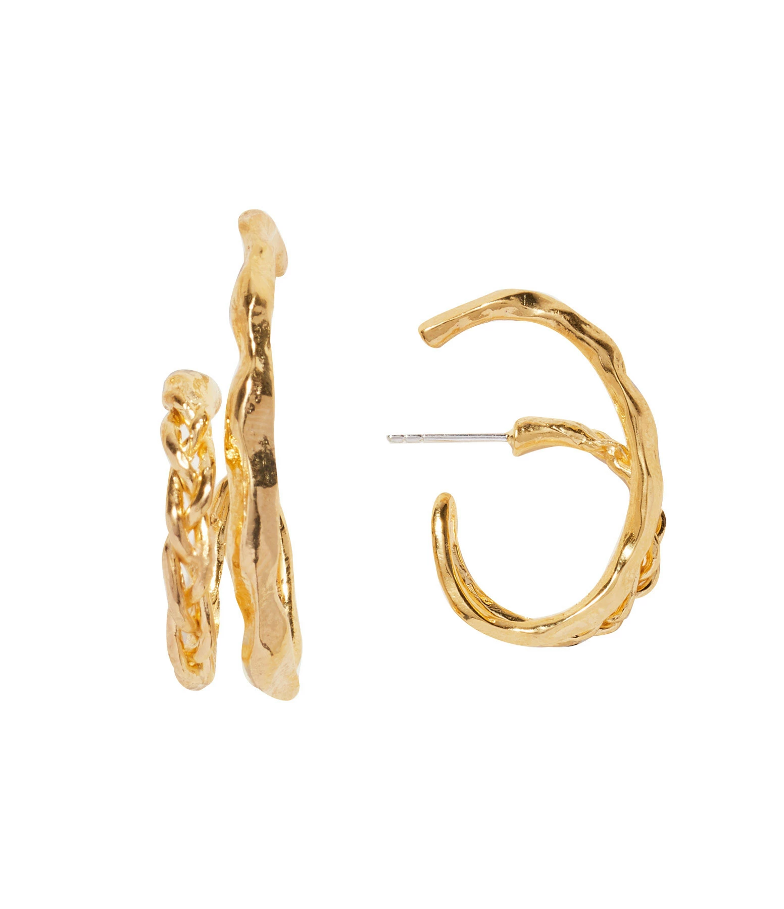 Boucles d’oreilles en laiton plaqué or tressé, composées de deux créoles dont l’une se positionne à l’intérieur de l’oreille.