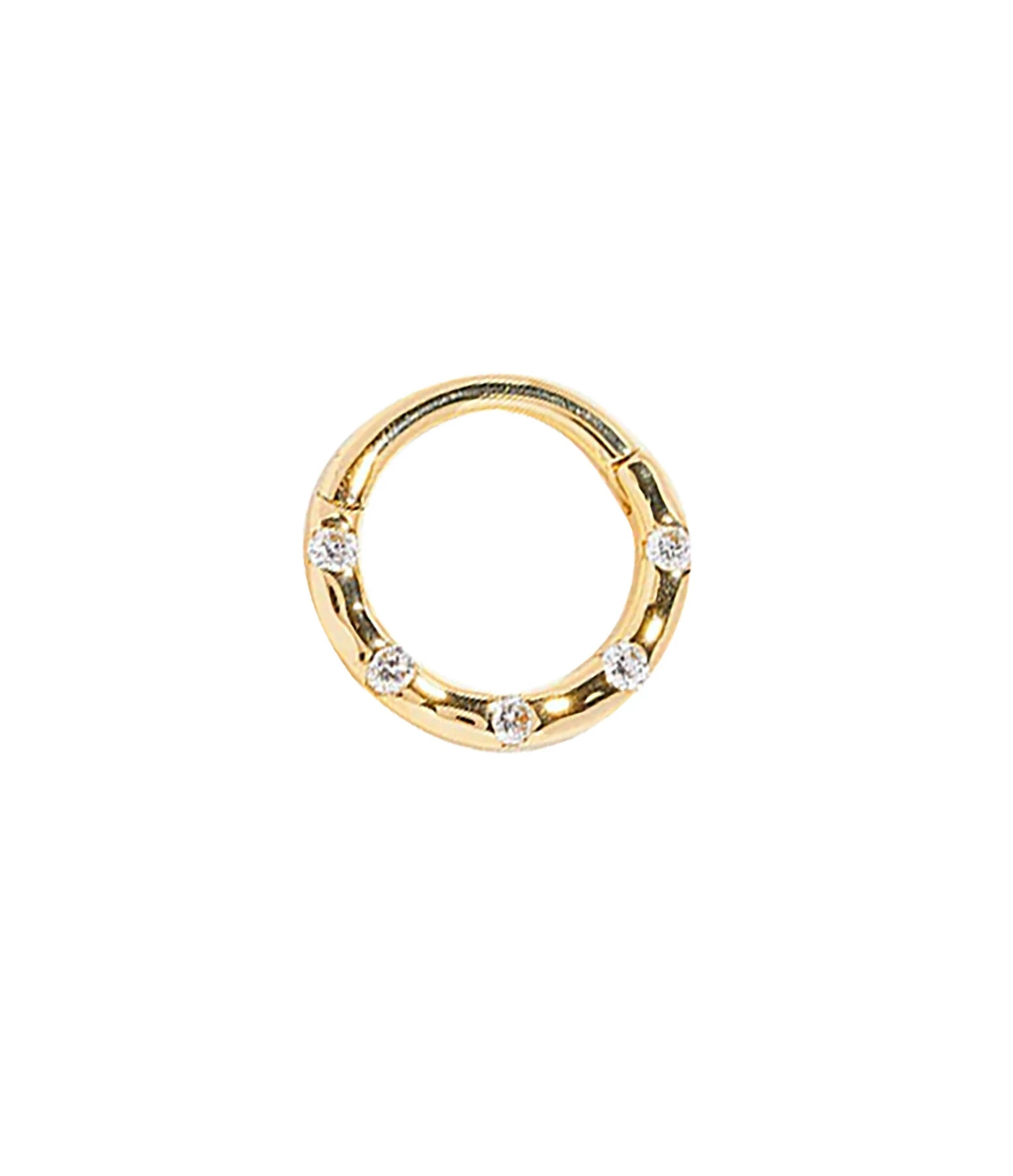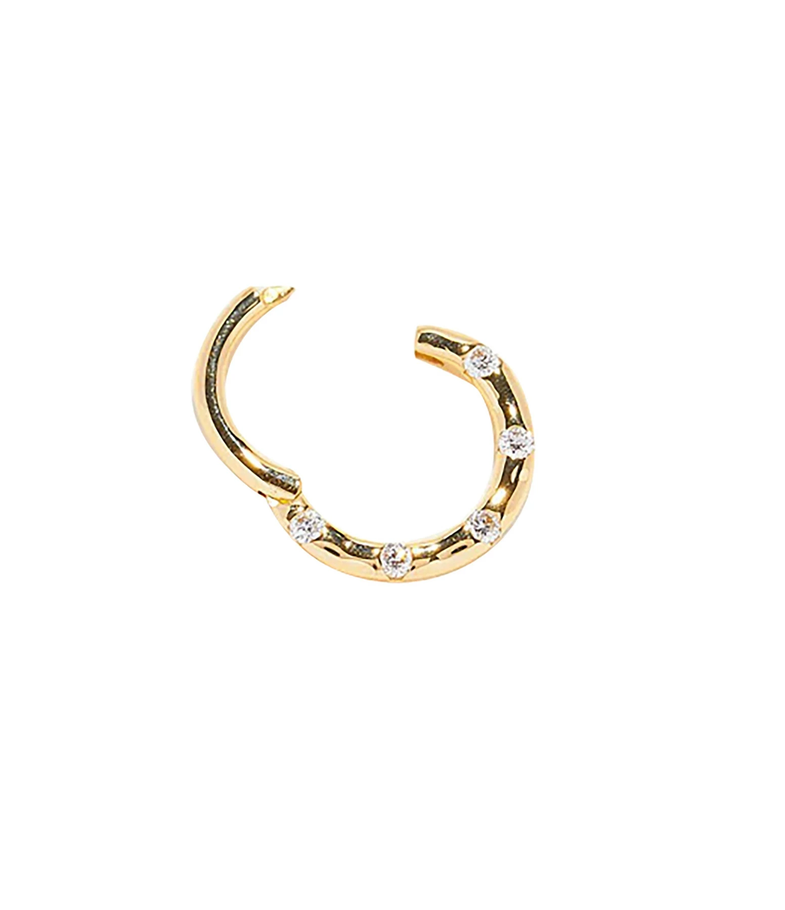 Mini créole avec des diamants blancs flottants, fermoir cliquet. Parfait pour le daith, l’hélix et le septum. Vendue à l’unité.