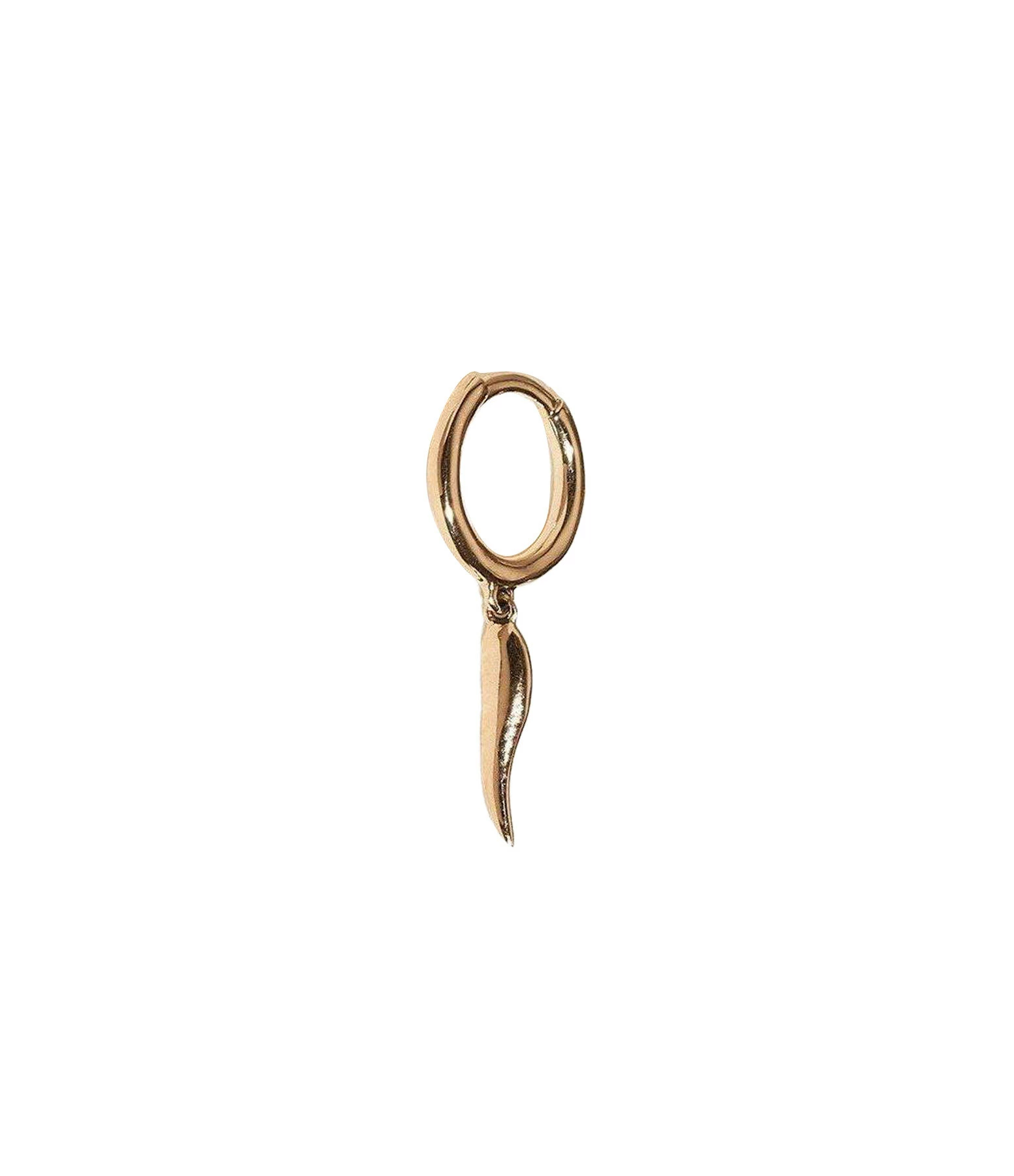 Mini créole en or jaune ornée d’une mini corne italienne ou Corno Portafortuna littéralement «corne porte-bonheur» en italien, une amulette portée pour se protéger du mauvais œil et de la malchance et favorisant la fertilité. Fermoir cliquet.