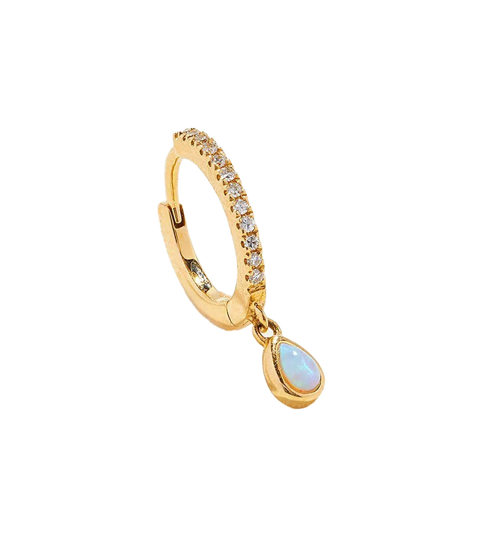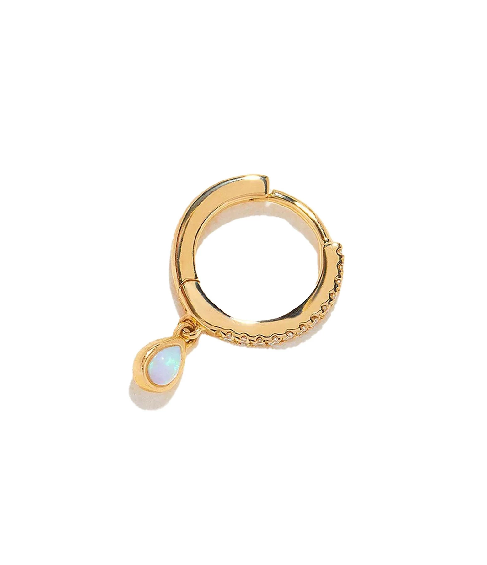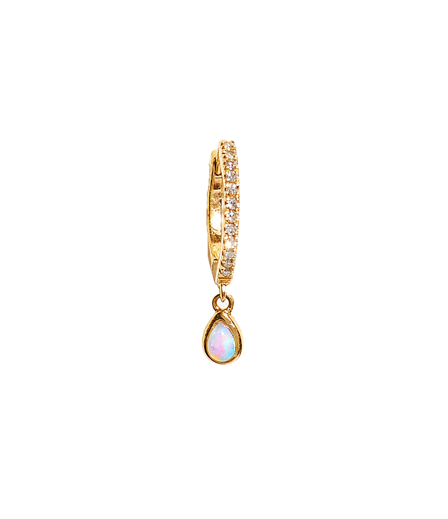 Mini créole en or jaune semi-pavée de diamants blancs, goutte avec opale incrustée. Fermoir cliquet.