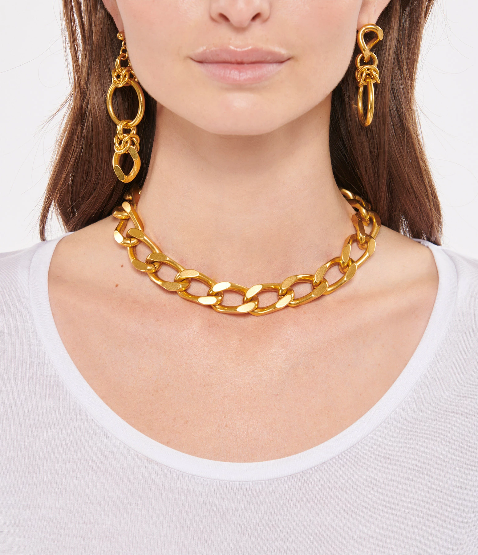 Boucle d’oreille asymétrique dorée. Maillons entrelacés.