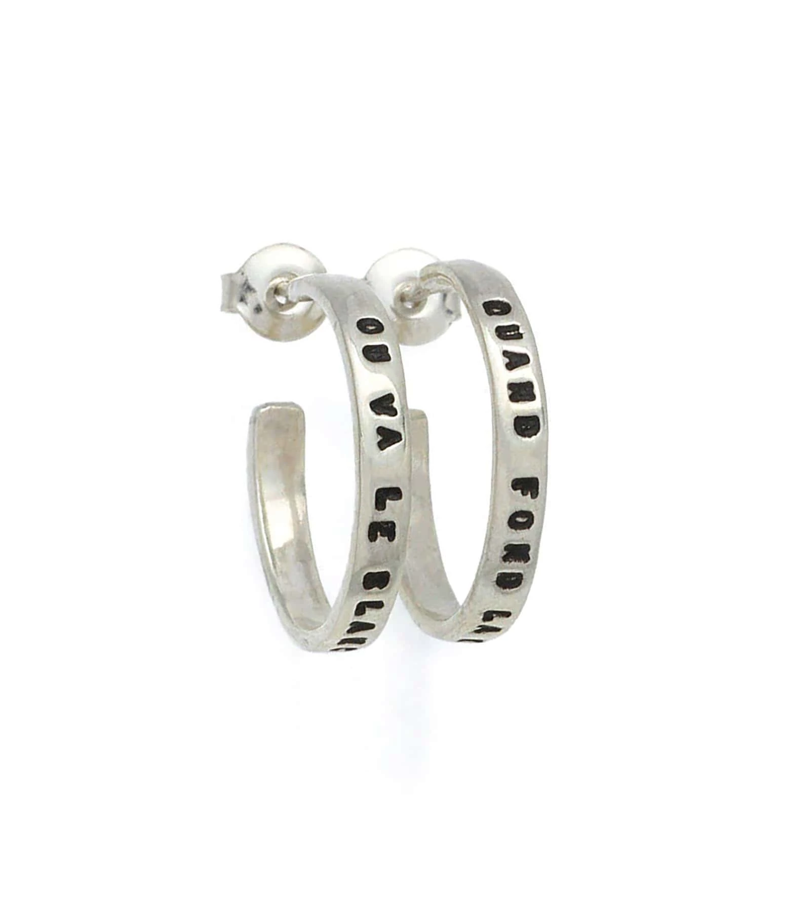 Boucle d’oreille créole argent avec gravure “quand fond la neige ou va le blanc”. Fermoir poussettes. Vendues à la paire.