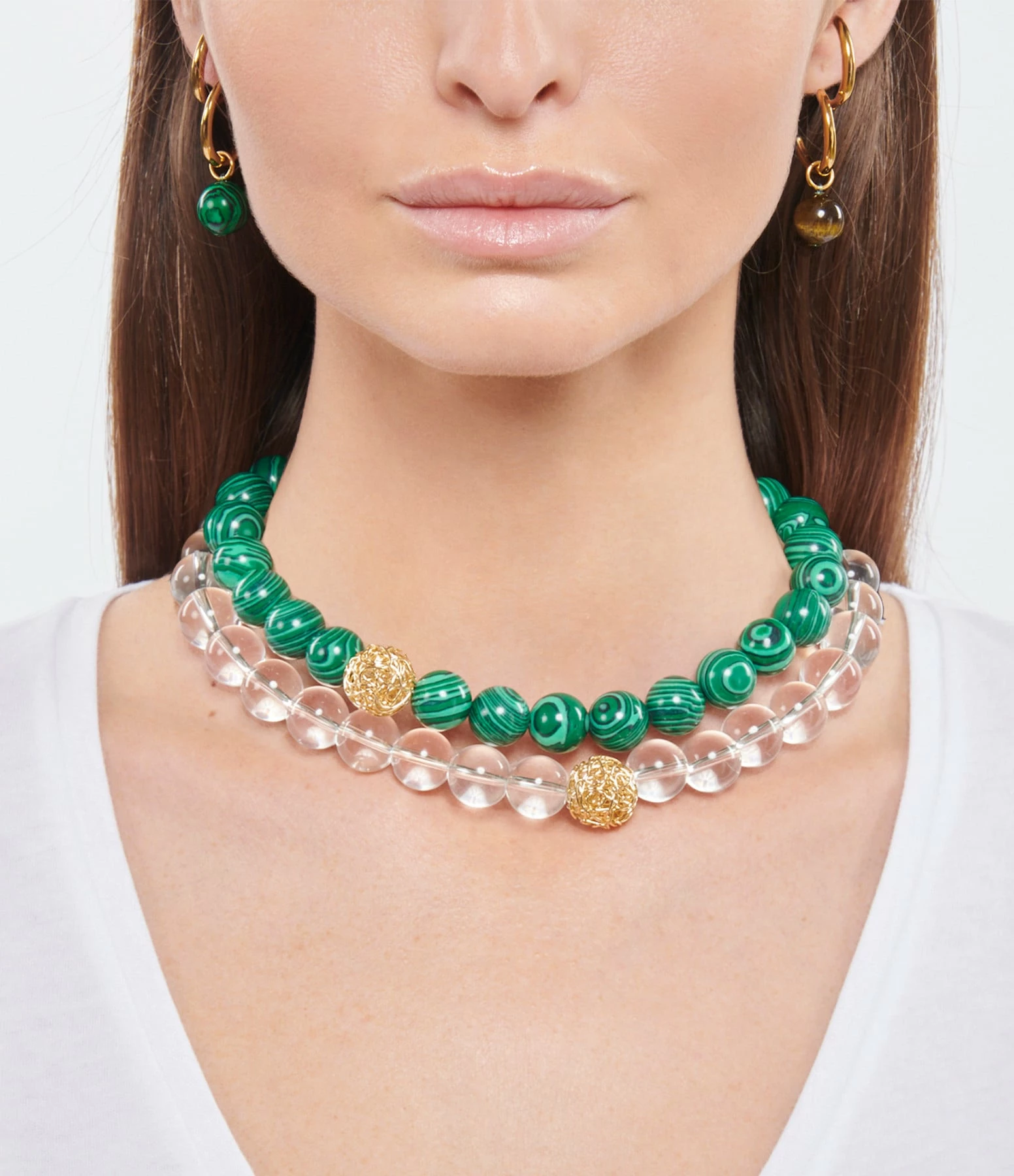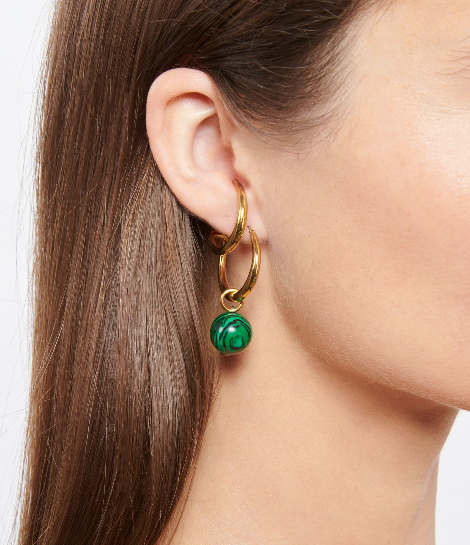 Boucle d’oreille en plaqué or, une avec une perle de malachite, l’autre avec une perle en œil de tigre. Une partie de la boucle se pose dans l’oreille.