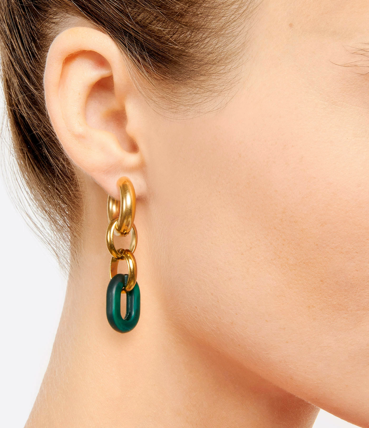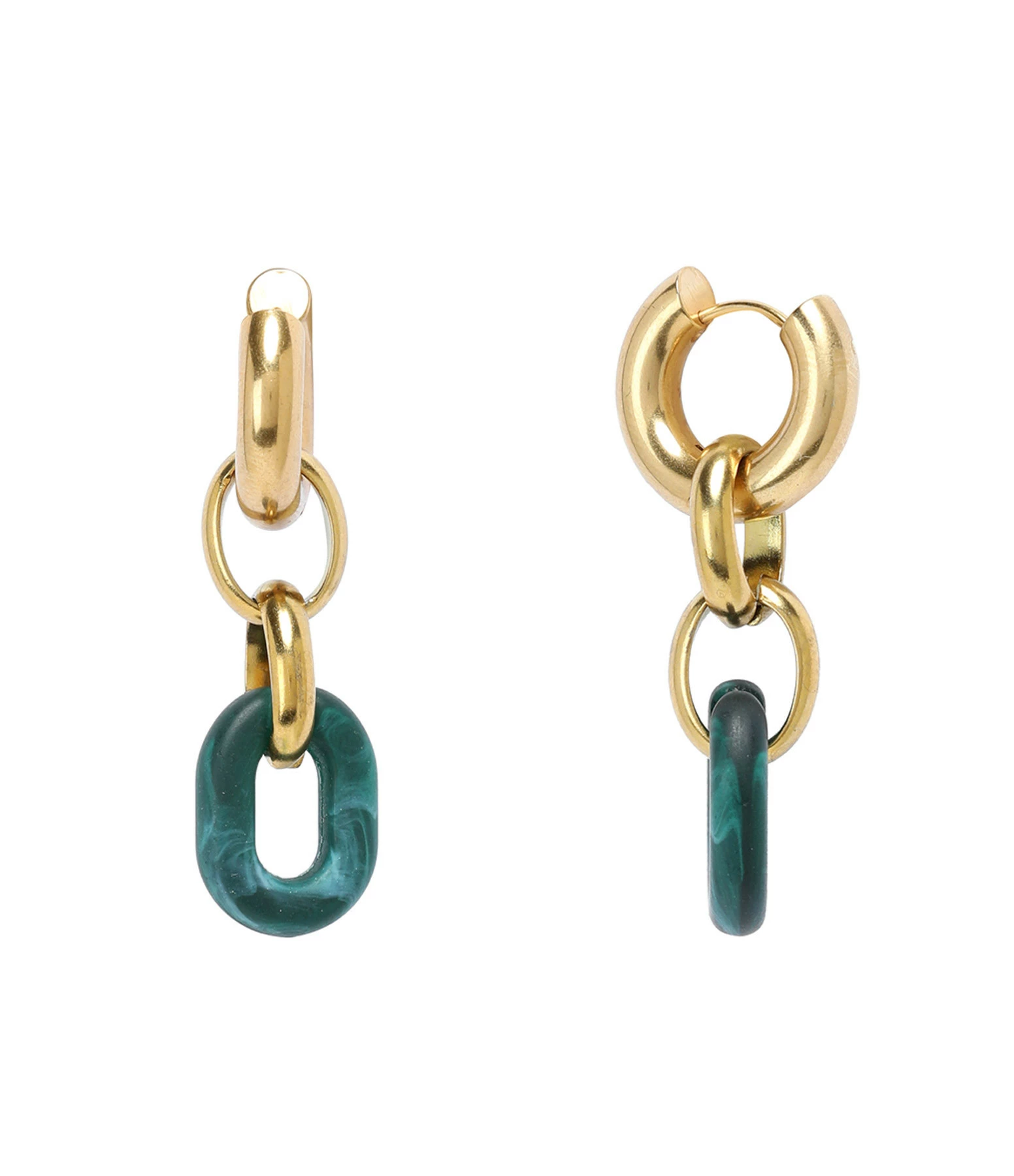 Boucles d’oreilles créoles avec chaîne en laiton plaqué or et un anneau vert. Fermoir cliquet.