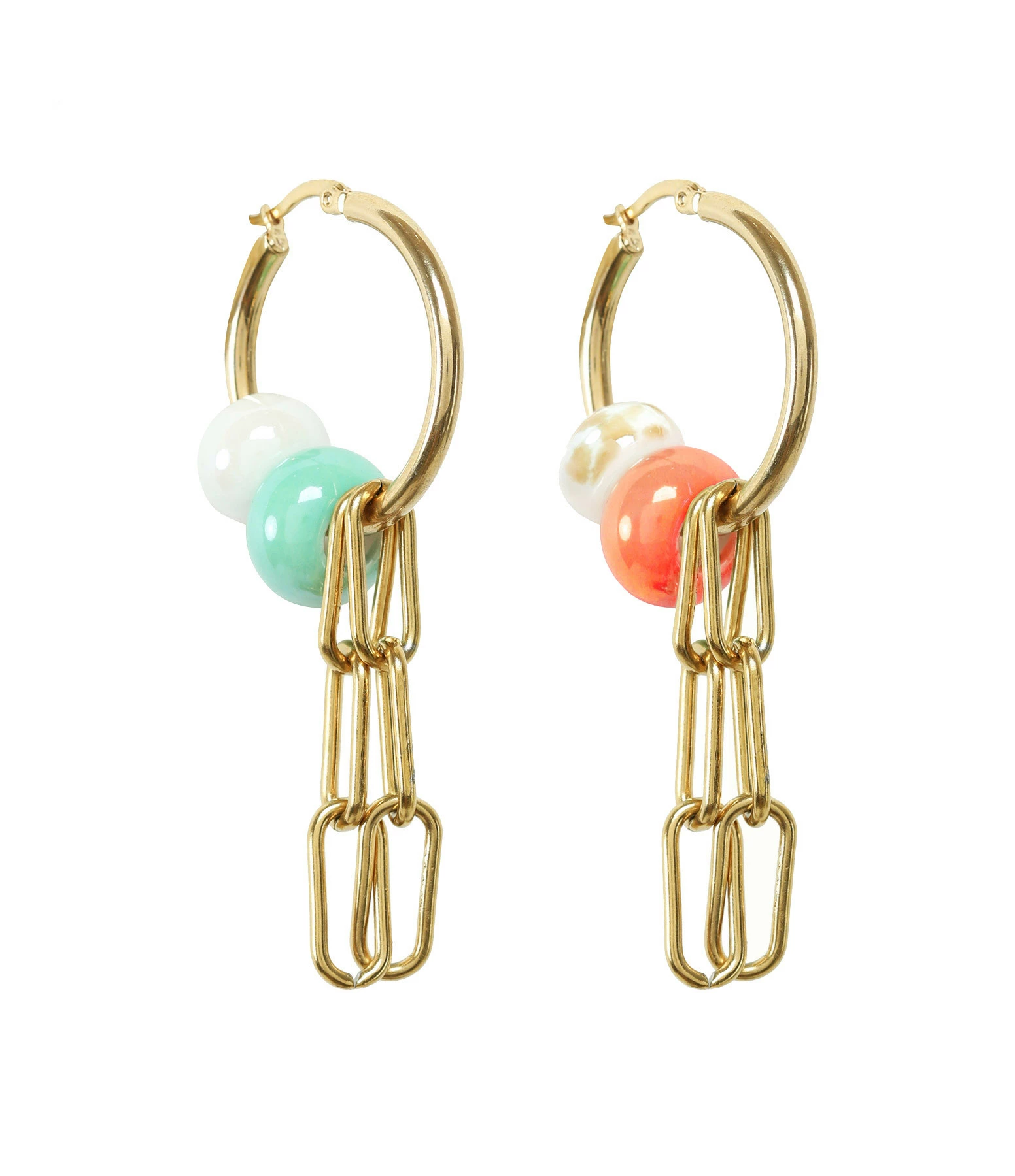 Créoles en laiton plaqué or avec chaîne et perles de couleurs. Fermoir cliquet. Vendues à la paire.