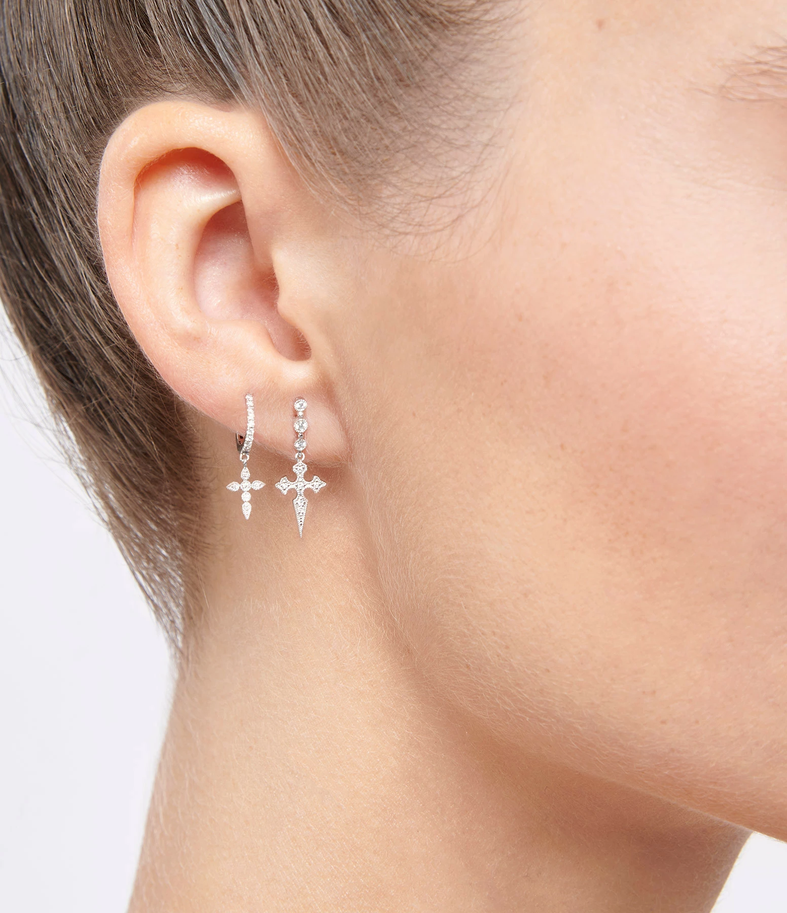 Boucle d’oreille or blanc et diamants, croix inspirée du Moyen-Age. Fermoir sécurisé par système Alpa. Vendue à l’unité.