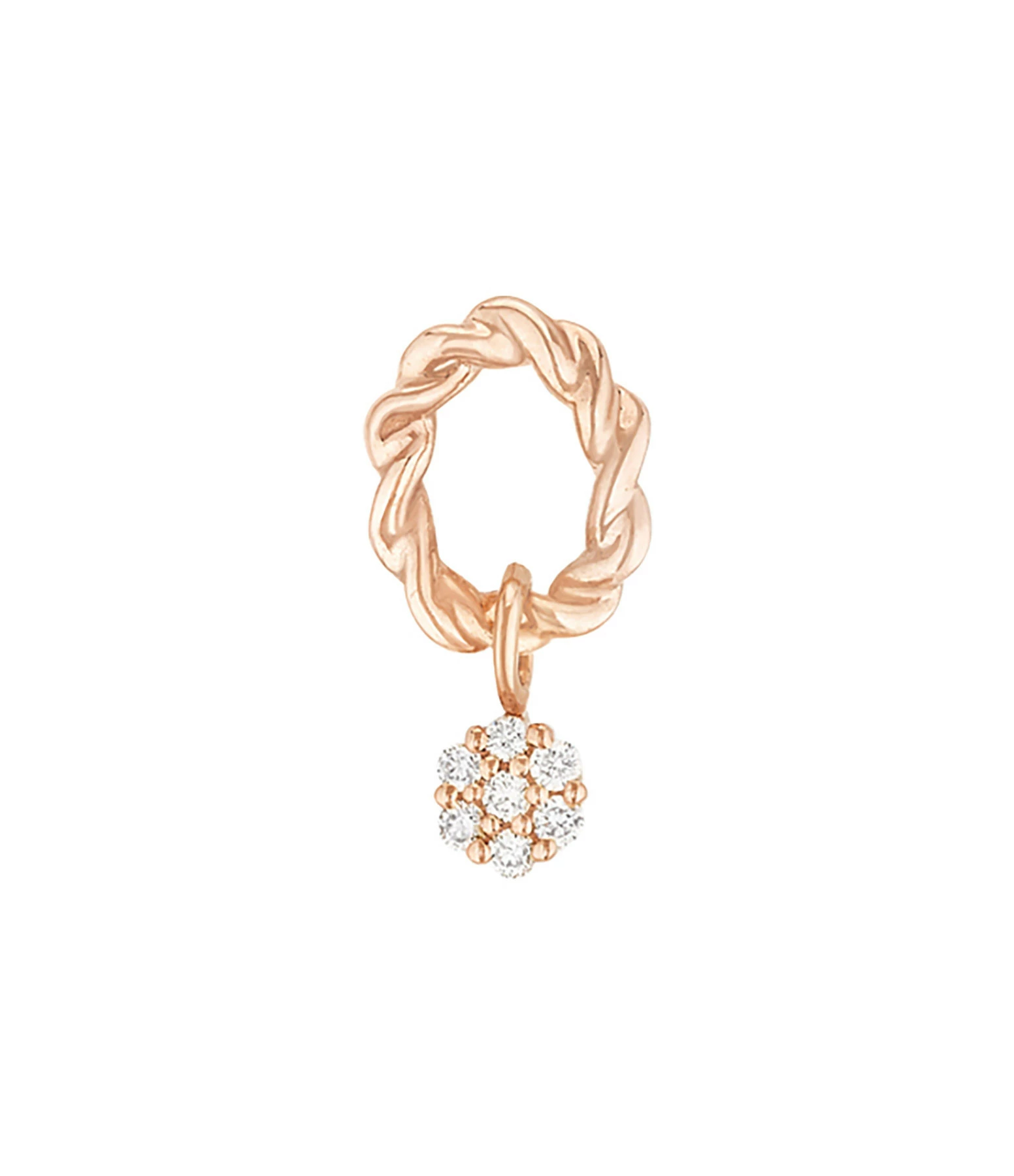 Boucle d’oreille puce en or rose avec pendentif sertie de sept diamants. Vendue à l’unité.