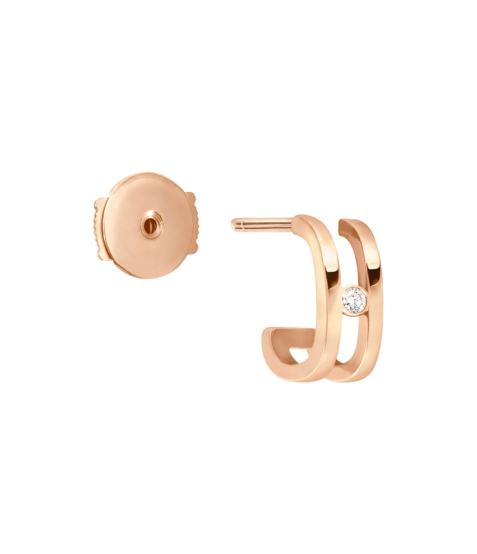 Boucle d’oreille en or rose double créole agrémentée d’un diamant blanc serti. Fermoir Alpa sécurisé.